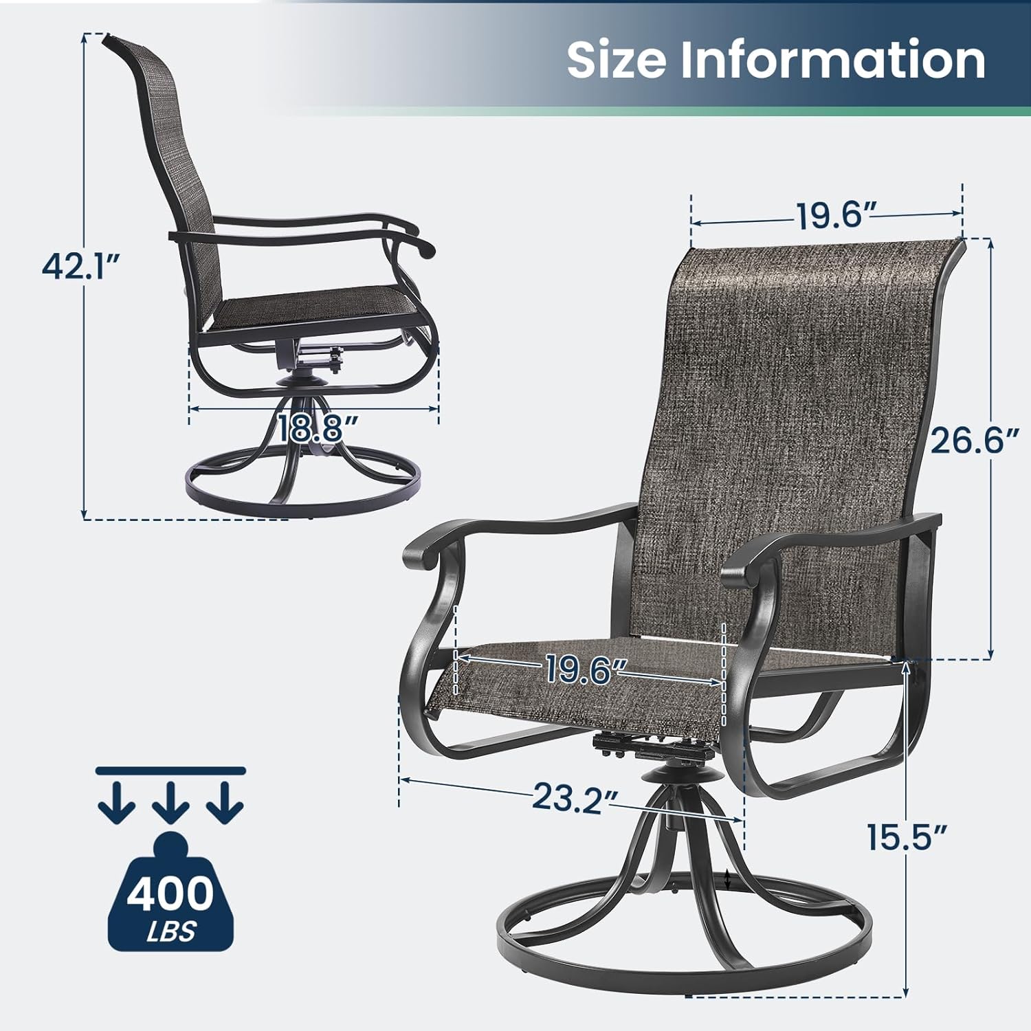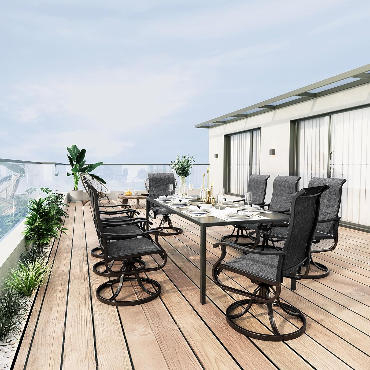 - ă360°SWIVEL & 15°ROCKING DINING CHAIRSăWith a smooth 360° swivel and a slight 15° rocking motion, these outdoor dining chairs offers great flexibility and comfort for relaxing and enjoying time outdoors with family and friends, even after long hours of sitting!