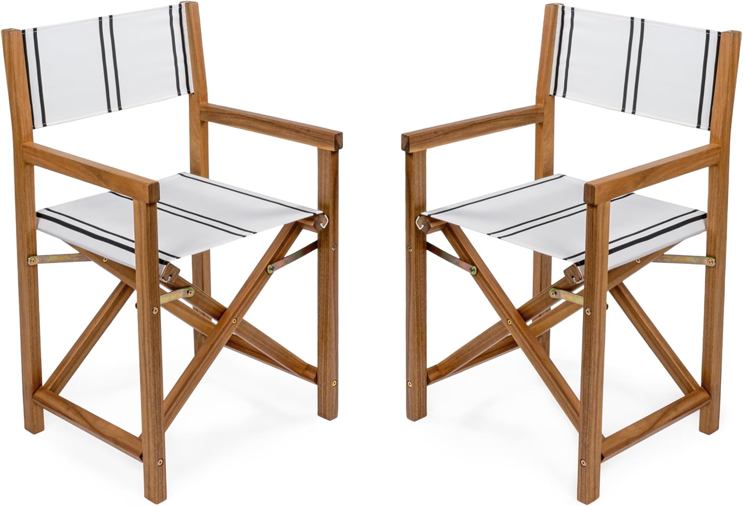 JONATHAN Y DRC1001B-SET2 Cukor Classic Vintage Outdoor Acacia Wood Folding Director Chair with Canvas Seat Mid-Century, Modern, Traditional, Classic, Coastal, White/Black Stripe/Teak Brown (Set of 2)