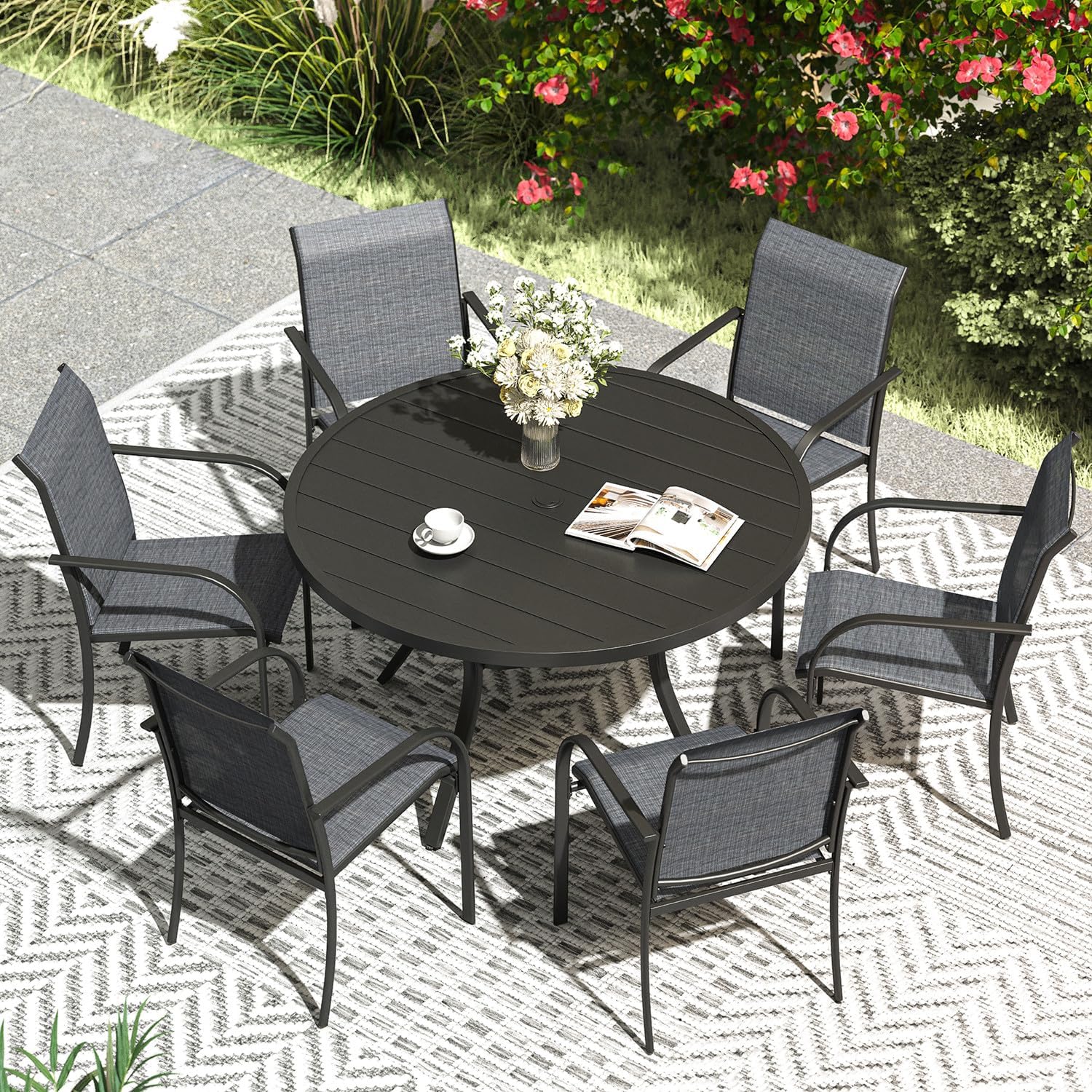 VICLLAX Patio Dining Set for 6, Outdoor Furniture Set Includes 47.2" Round Patio Table and 6 Patio Sling Chairs, Black Tabletop and Grey Fabric