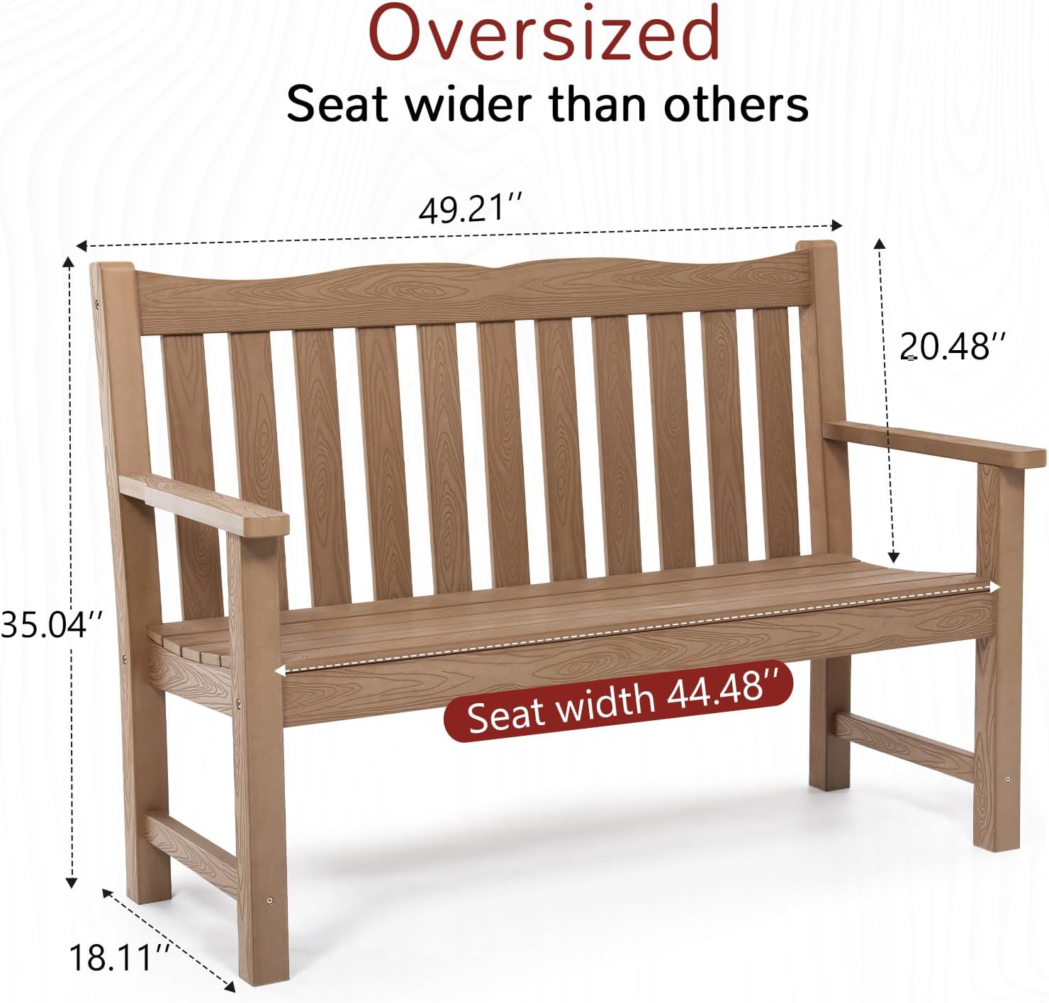 Outdoor Bench, 2-Person Poly Lumber Garden Bench, All-Weather Outside Bench with 800 lbs Weight Capacity, Never Rot or Fade, Looks Like Real Wood, Teak