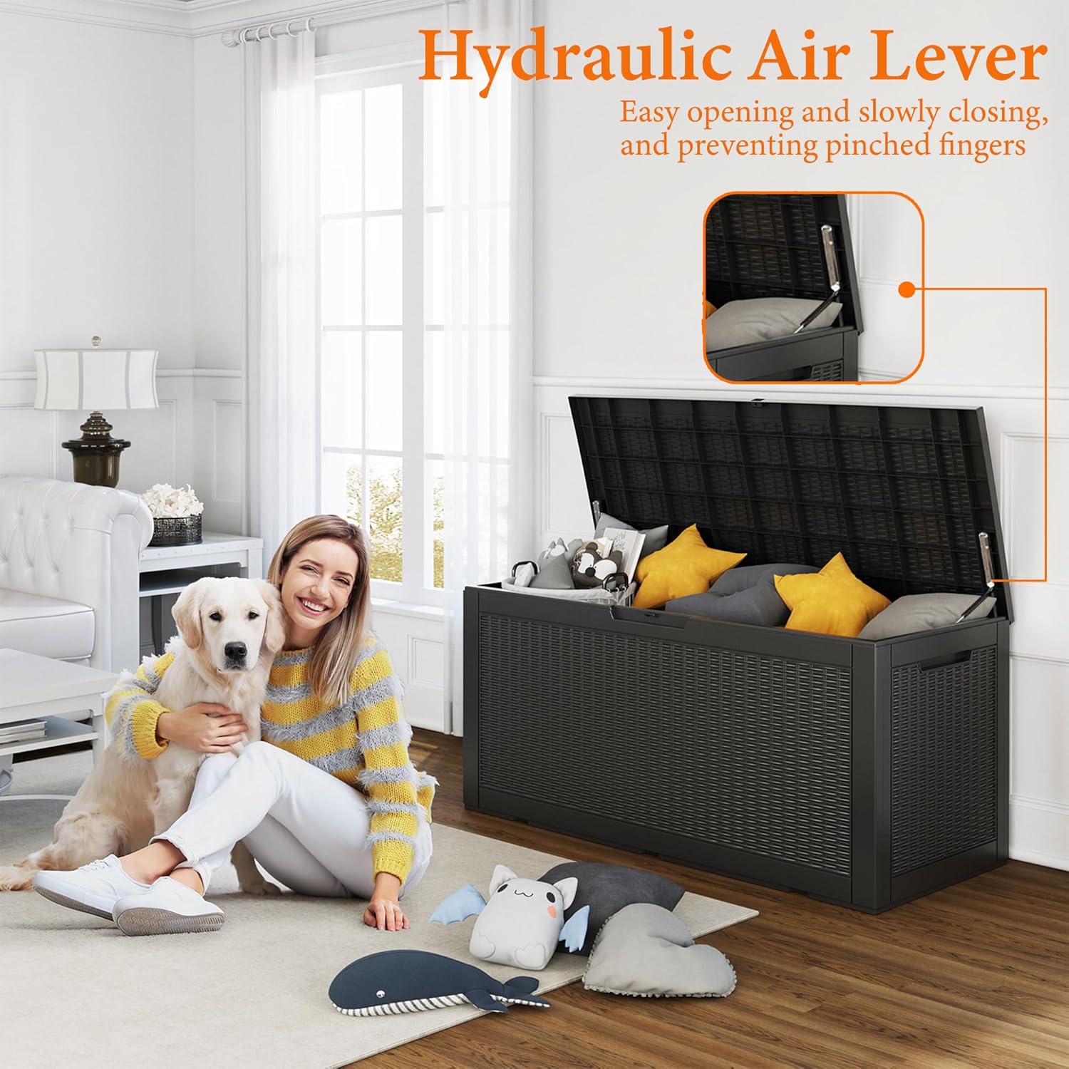 100 Gallon Resin Deck Box, Lockable Patio Outdoor Storage Box for Furniture, Garden Tools and Tools Storage, Waterproof Outside Storage Boxes - Black