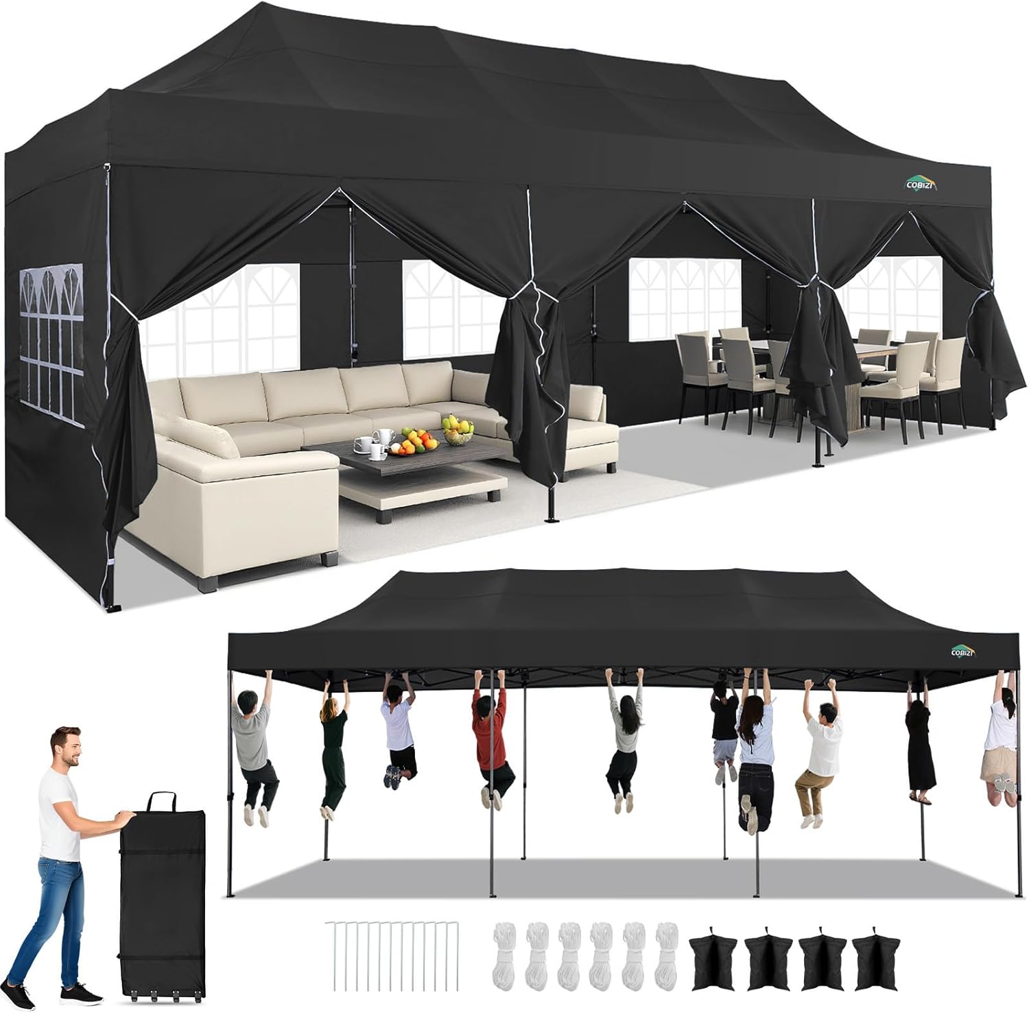 COBIZI 10x30 Pop up Canopy Heavy Duty with 8 Sidewalls, Easy Set-up Commercial Outdoor Party, 100% Waterproof Wedding Canopy Gazebo, 3 Height Adjustable with Wheeled Bag, Black