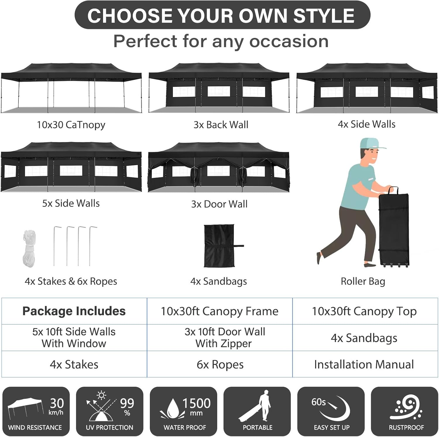 - 【WHAT'S INCLUDED】1x Commercial grade 10x30 Pop up Tent Frame, 1x 10'x30' Canopy Top Cover, 8x PU Coated Panels (5x Sidewalls with Window and 3x Sidewalls with Zipper), 4x 420D Oxford cloth PVC coated Sandbags, 4x Ground Pegs, 6x Wind Ropes, 1x Roller bag, 1x Manual. If you have any questions and doubts, please feel free to contact us, we will give you the best help. Choosing us means choosing a comfortable life.