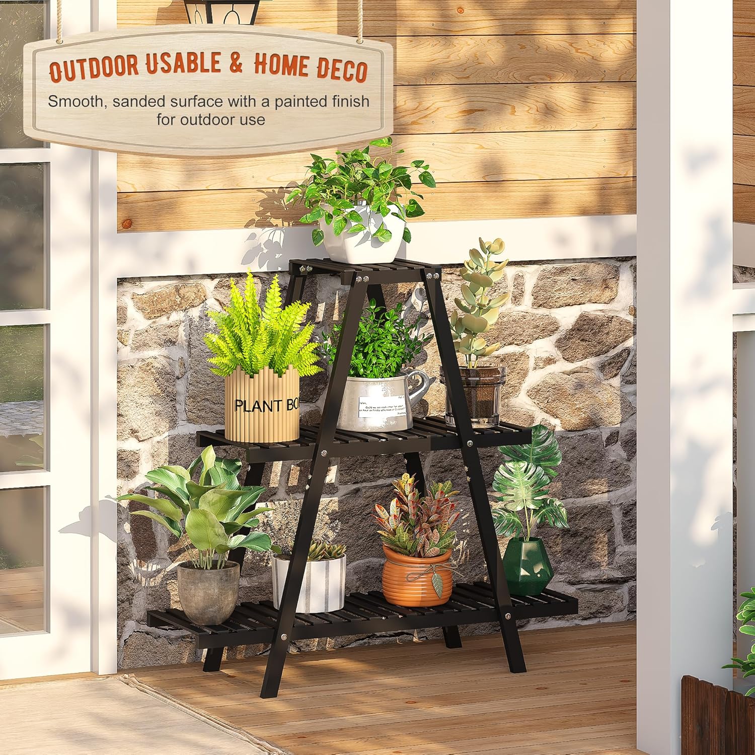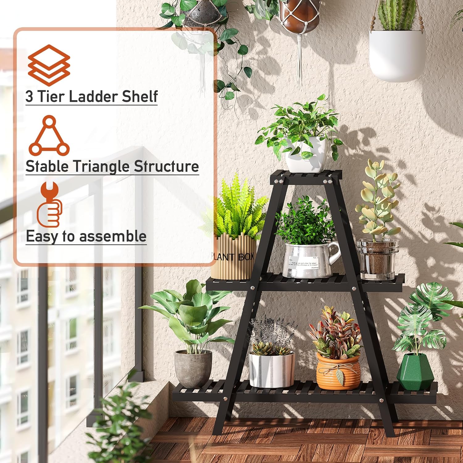 Plant Stand Indoor Plant Shelf Outdoor bamboo Plant Rack, 3 Tiers Ladder Plant Holder Flower Stand for Living Room Balcony Garden Patio,Living Room Boho Home Decor for Gardening Gifts (Black)