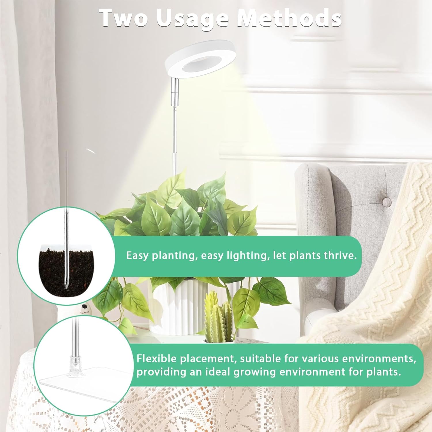 - Desk Grow Light for Home Garden Lighting Solution: This plant grow light comes with a detachable base, it has 2 use methods: 1. Base method ; 2. Insert into the soil directly. perfect solution for office desk,living room, dark corner in house,doesn’t take up valuable space, they just fit in with decor.Halo light design to help your plants grow happier and healtier!