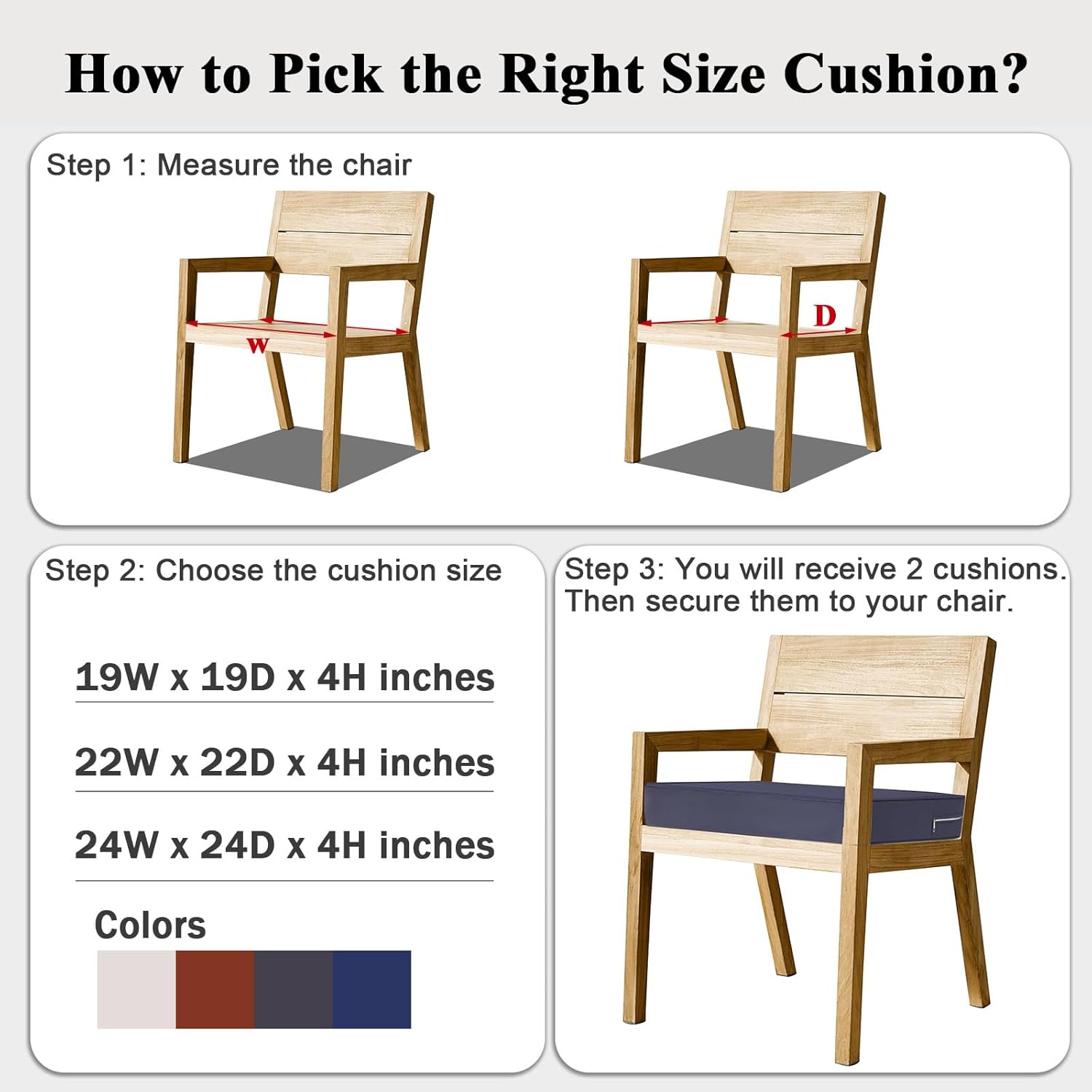 - PERFECT SIZE: Outdoor chair cushion set includes 2 cushions. Cushions measure: 24 inch (W) 24 inch (D) 4 inch (H). Fits most standard size outdoor chairs. Since the outdoor cushions are vacuum-packed, it may take 24-51 hours for the cushion foam to fluff back up after opening the vacuum bag