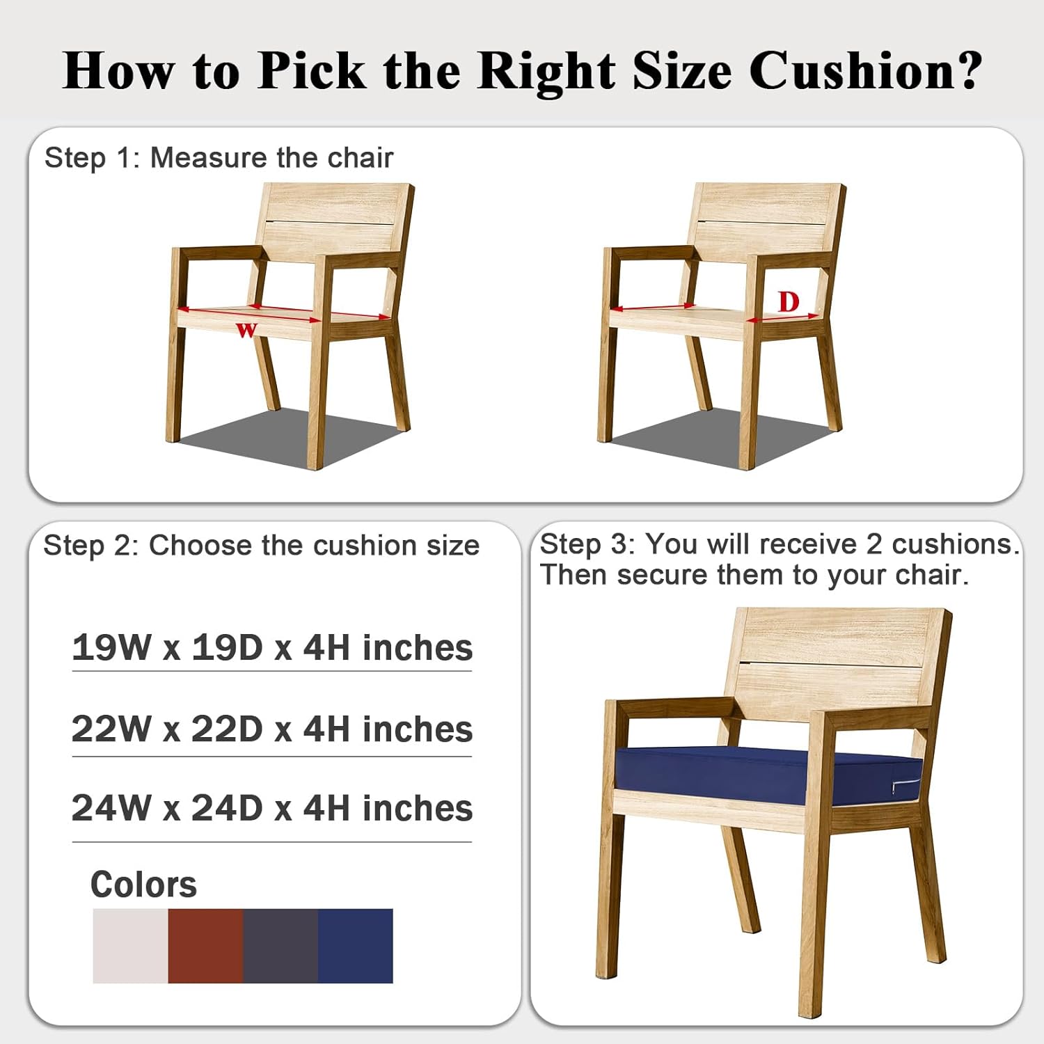 - PERFECT SIZE: Outdoor chair cushion set includes 2 cushions. Cushions measure: 24 inch (W) 24 inch (D) 4 inch (H). Fits most standard size outdoor chairs. Since the outdoor cushions are vacuum-packed, it may take 24-49 hours for the cushion foam to fluff back up after opening the vacuum bag