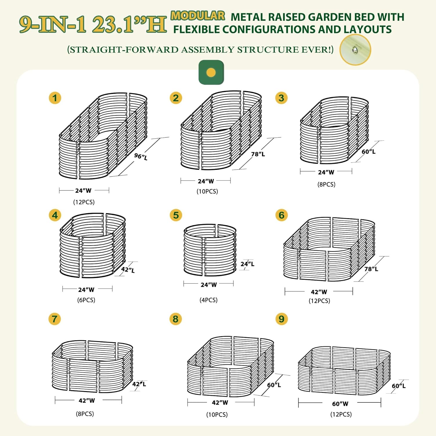 - 9-IN-1 MODULAR PLANTER BOX- This garden bed comes with 4 corner panels and 8 side panels for 9-in-1 modular kit, which allows you to modularize it with flexible configurations and layouts, making the most of your garden space. There are 9 or more different combination options for you to DIY your own garden bed.