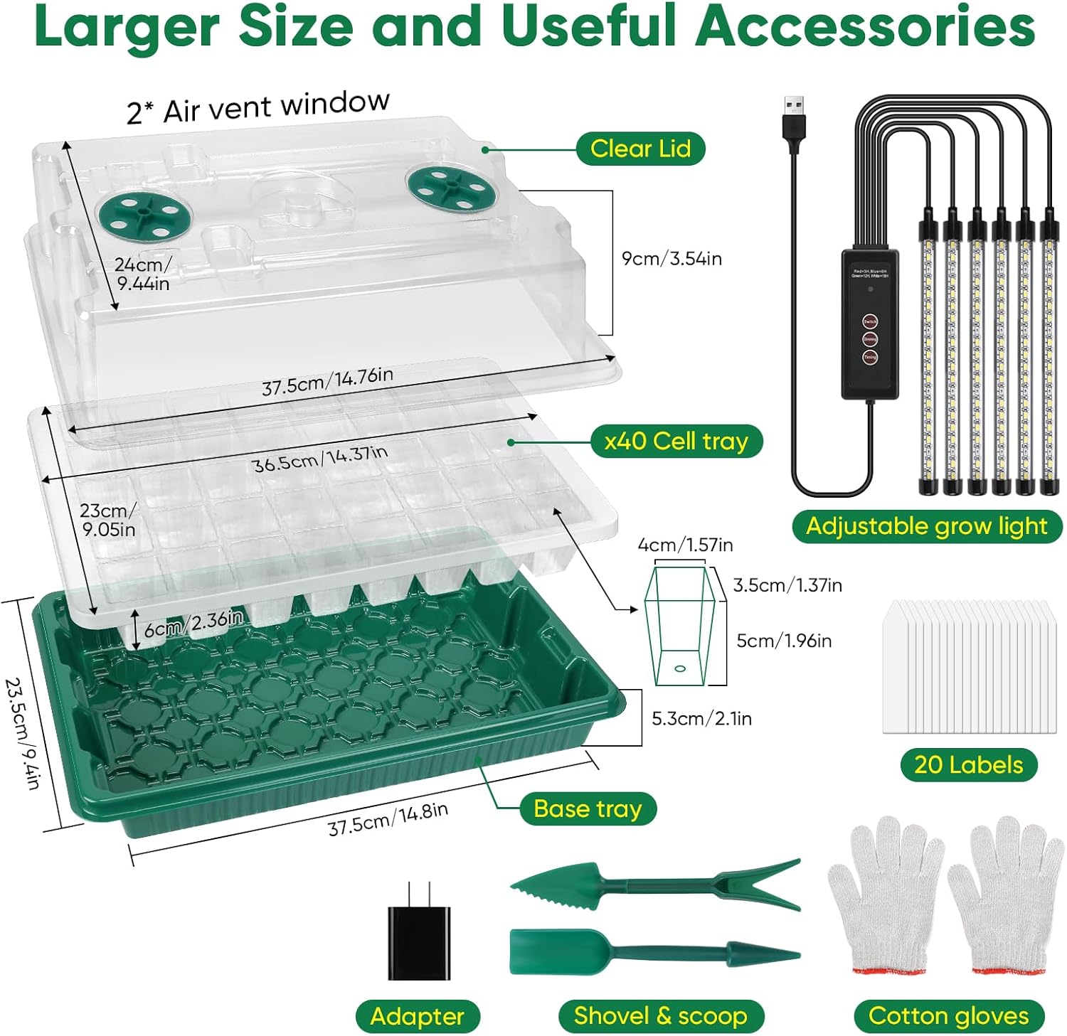 - 【360°Spectrum Grow Light】 Larger grow light cover spectrum for better seedling grow, this product has upgraded 4 full spectrum strip plant growth lights insert on the Dome of the plant starter kit, and also has improve the light. Now you can adjust and timed the light as you need, you don’t have to stay at home ! Withe& blue Light will help seedling growing faster and better. You can use this product by USB port or just plug-in,4 lighting modes & 4 timing functions (3H/6H/12H/18H) & 5 brightness modes, providing a better garden tool for anyone!
