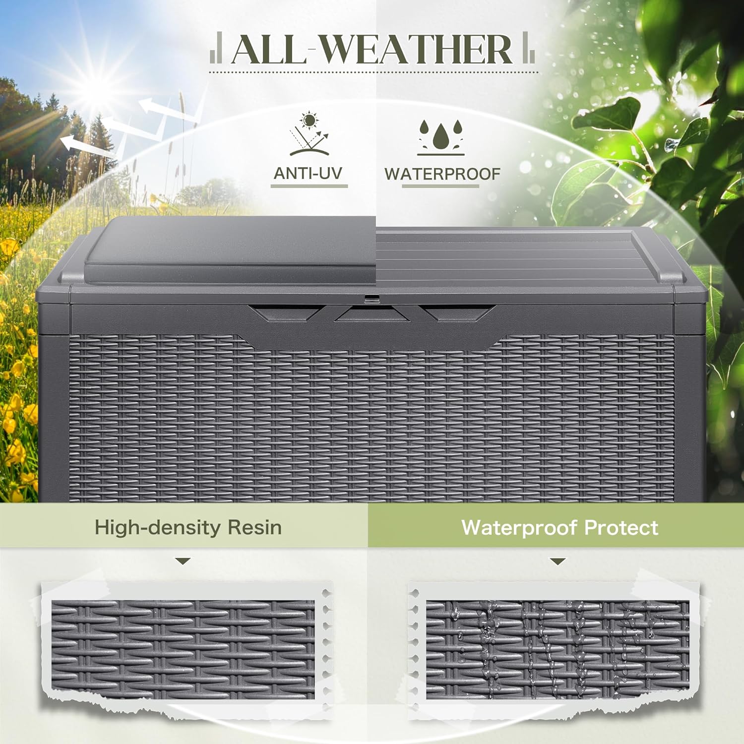 - RESIN MATERIAL: The storage box is made of environmentally friendly resin material, this material has good anti-color fading and waterproof and UV resistance, and very good toughness and durability.