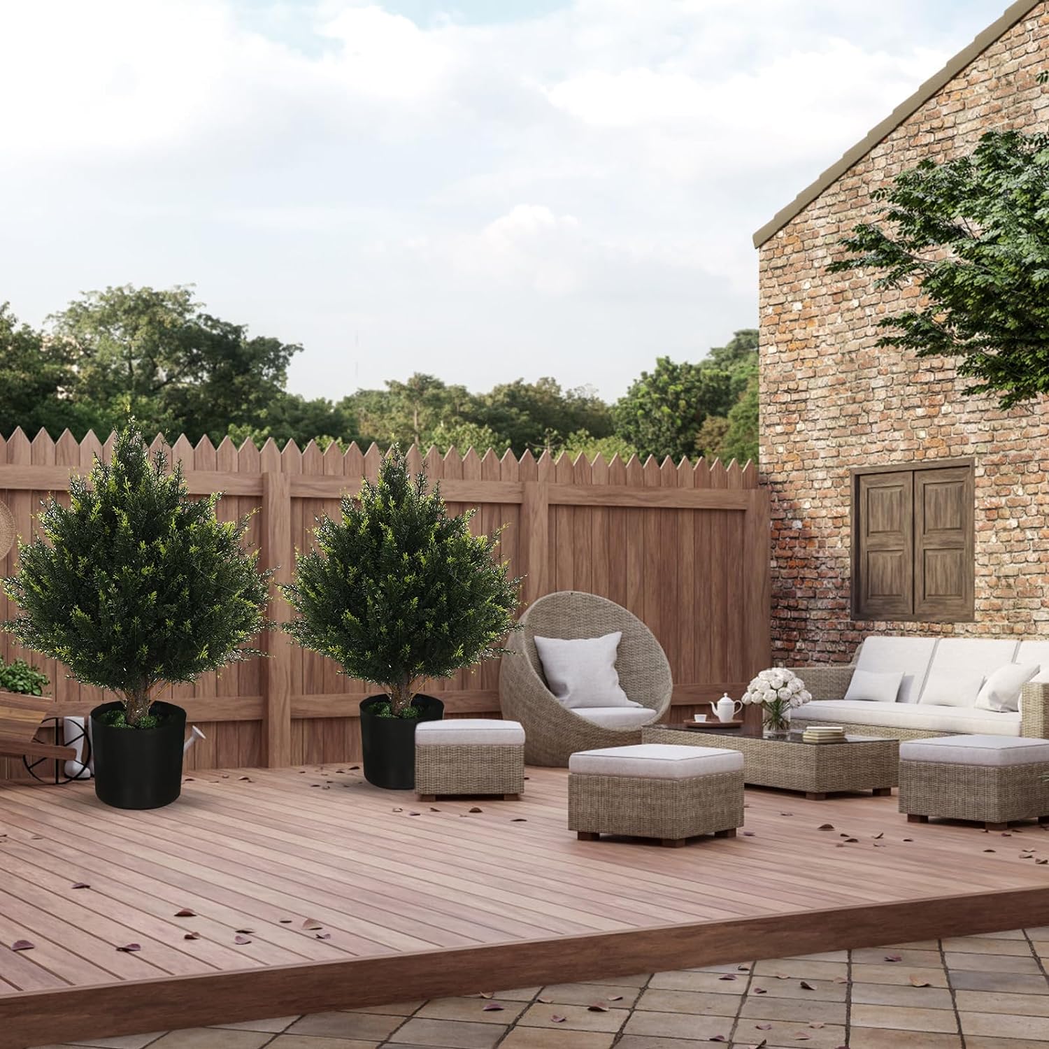 - Product size: The topiary trees artificial indoor in outdoor is19”*13”*13”, provided with a black plastic flowerpot with 4.5 inches height and 5 inches width. The height of cedar is measured from the bottom of flowerpot to the leave atop the cedar, and the width of cedar is measured from the leftmost leave to the rightmost leave,The products are made manually. It is normal to have 1 inch error in measurement. Please be prudent in buying if you mind it