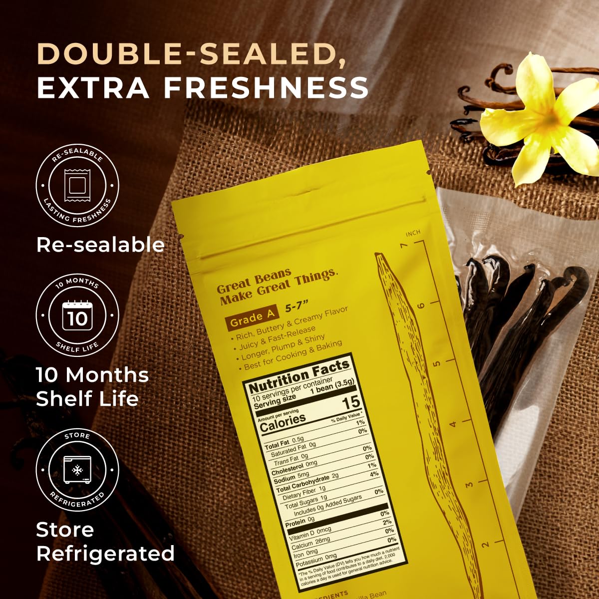 - Perfect for Any Dish. Sized at an estimated 5-7 inches, our juicy vanilla beans grade A are much bigger compared to other vanilla pods. Cherished for its rich and heavenly aroma, use grade A vanilla beans for syrups, teas, cookies, cakes and more!
