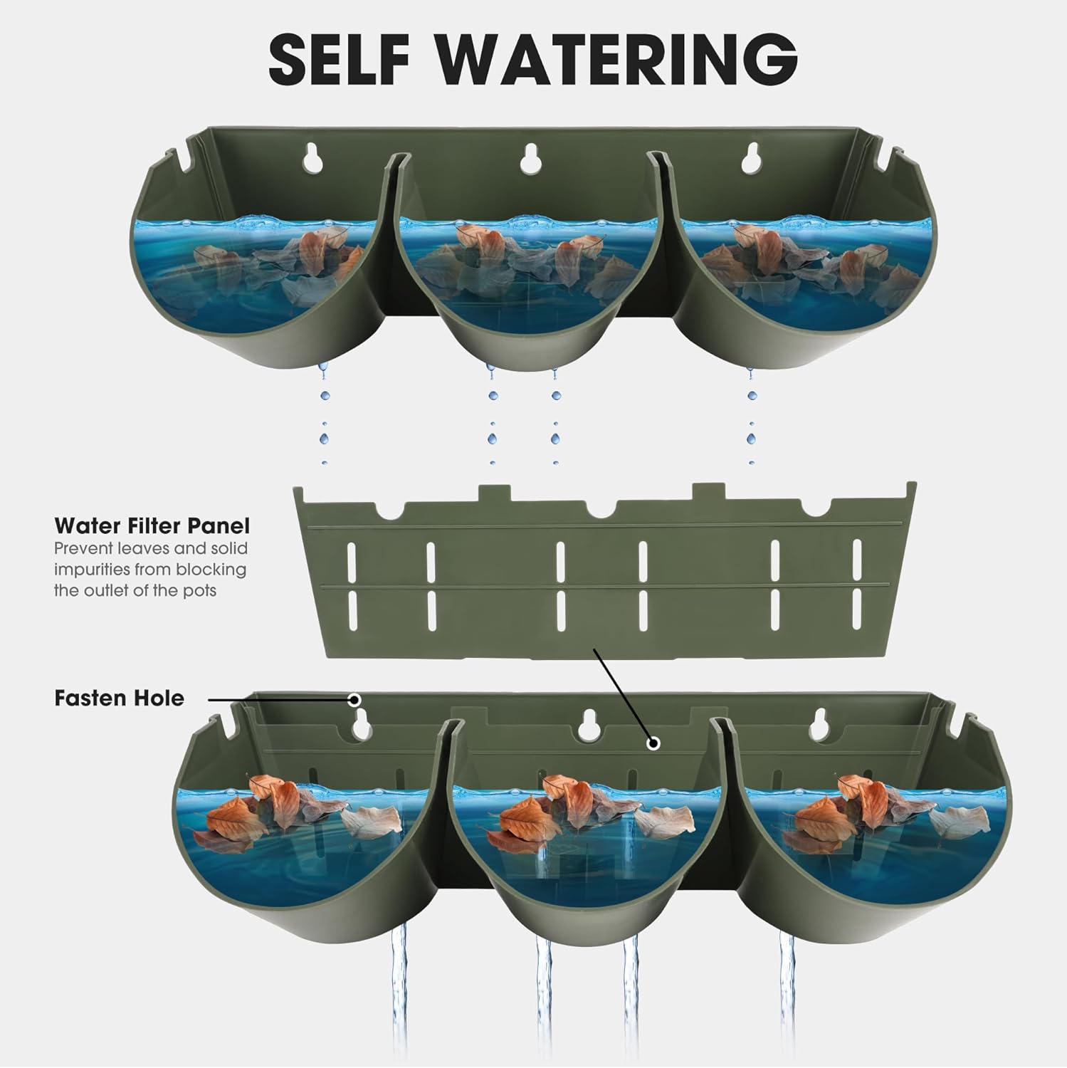- STACKED VERTICAL DESIGN: The water filtration system from top to bottom can effectively save and retain moisture; Includes 6x water filter panels used to prevent leaves and solid impurities from blocking the outlet of the pots, 24x water level plug used to control the water level and 24x chock plugs to close the pot outlet and stop water leaking