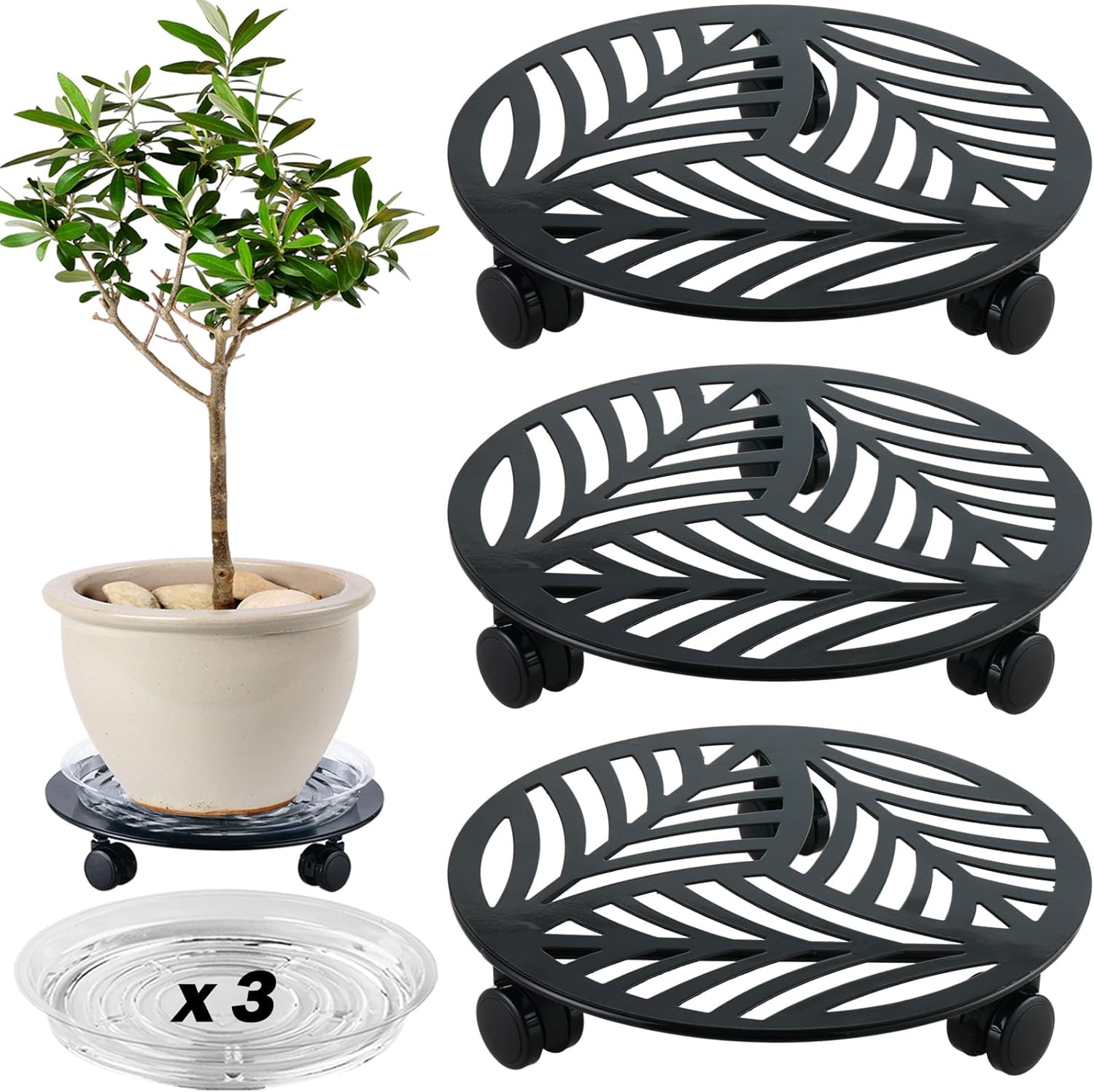 - Unique Leaf Pattern Design: The package will come to you with 3 packs of 12” large PU wheeled metal plant caddy, 3 packs of 10" clear plant saucers and a wrench, which the metal plant caddy is self-designed unique leaf pattern.