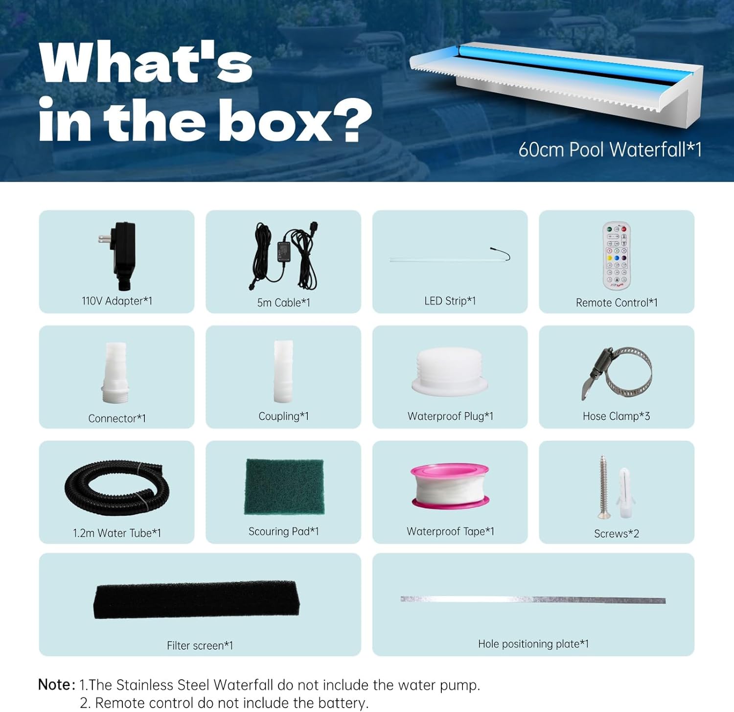 - 【Decoration Waterfall】Weejian waterfall spillway will make a decorative addition to your garden patio pond or swimming pool, it makes them more elegant, fashionable and beautiful. The color change of LED lights and the gentle sound of water running make your patio more special at night.