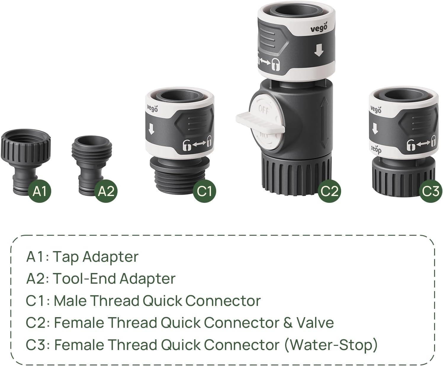 Vego Quick Connector Set with Shut-Off Valve, Water Stop & Lock, and Adapters for Effortless Hose Connections Feature Quick Release Kit Hose Fittings and Adapters- V1 Set of 6