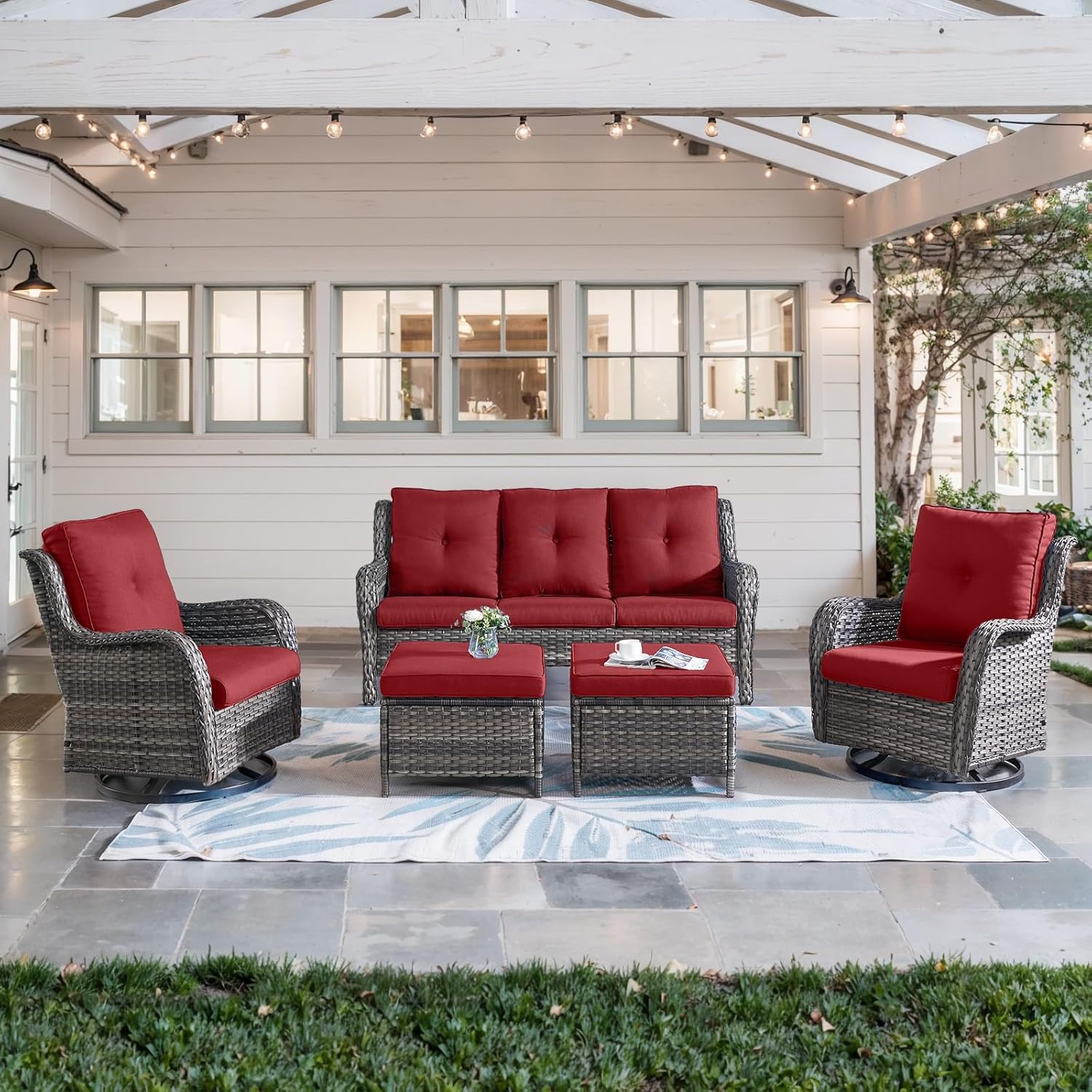 5 Piece Outdoor Patio Furniture Set - Wicker Furniture Patio Conversation Set, Outdoor Swivel Rocker Chairs with 3-Seater Sofa and 2 Ottomans for Small Space, Red Cushion