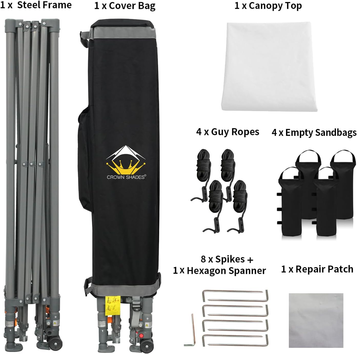 - HIGH GRADE STEEL FRAME - The durable, high-grade, corrosion-resistant steel truss frame with hardened through bolts comes pre-assembled and can be set up without any tools. Engineered to support up to 120 lbs. distributed across the frame, it ensures robust and reliable performance. The extended ceiling assembly and upgraded high peak design make it easier for rainwater to run off, preventing water pooling on the canopy. Perfect for extended outdoor use at markets, festivals, and exhibitions