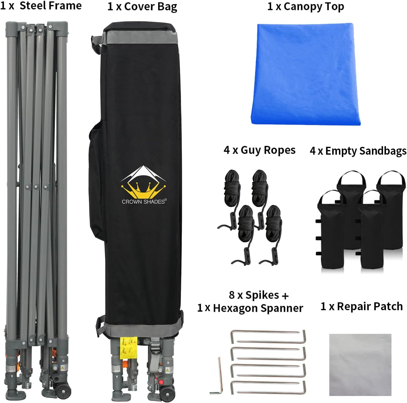 - HIGH GRADE STEEL FRAME - The durable, high-grade, corrosion-resistant steel truss frame with hardened through bolts comes pre-assembled and can be set up without any tools. Engineered to support up to 120 lbs. distributed across the frame, it ensures robust and reliable performance. The extended ceiling assembly and upgraded high peak design make it easier for rainwater to run off, preventing water pooling on the canopy. Perfect for extended outdoor use at markets, festivals, and exhibitions