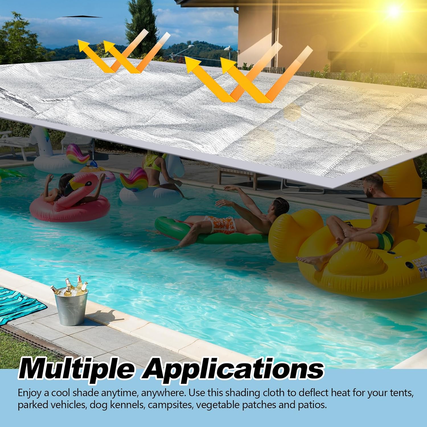 - Versatile Applications: easily create a cool shade anywhere, anytime with this versatile aluminum sun shade; It's ideal for providing shaded areas for your tent, parked vehicle, dog kennel, camping site, vegetable garden, swimming pool, and patio by reflecting the heat effectively