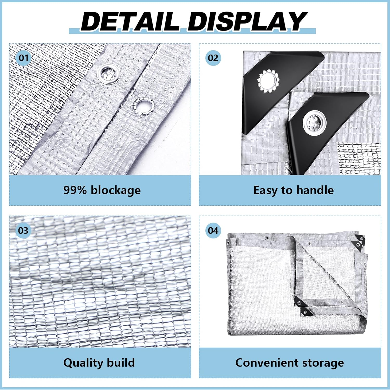 - Material with Excellent Shading Effect: made of aluminium foil film, this 99% reflective aluminium foil sun shade cloth helps in heat dissipation, light reflection, and radiation deflection, maintaining a cool environment even under harsh sunlight; More than just offering high durability, it is resistant to water, heat, fading, corrosion, and shrinkage
