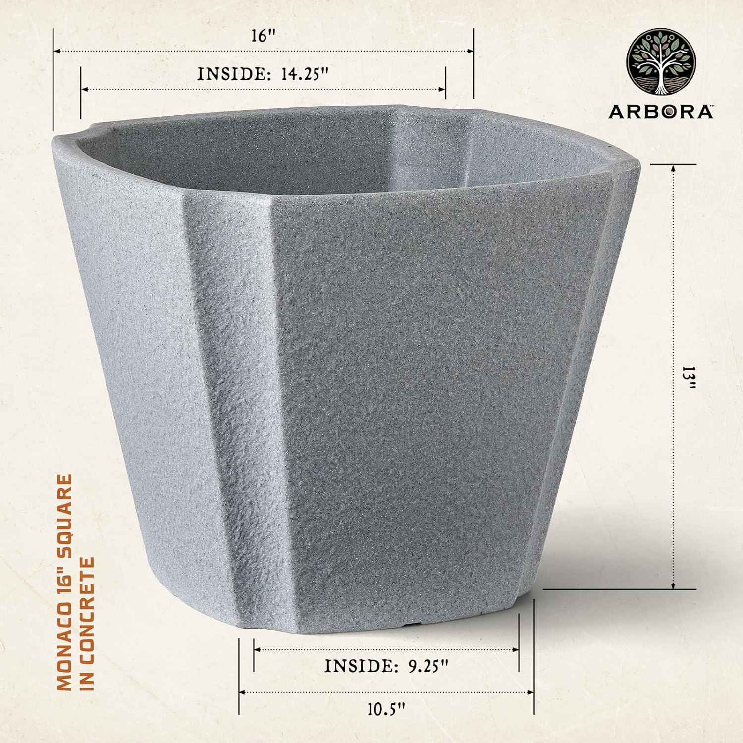 - Premium Polyresin Pots - Elevate your space with the Arbora 16" Monaco Square decorative planter, with a natural textured surface and concrete gray finish for a touch of sophistication. Ideal for both outdoor gardens and indoor living areas.