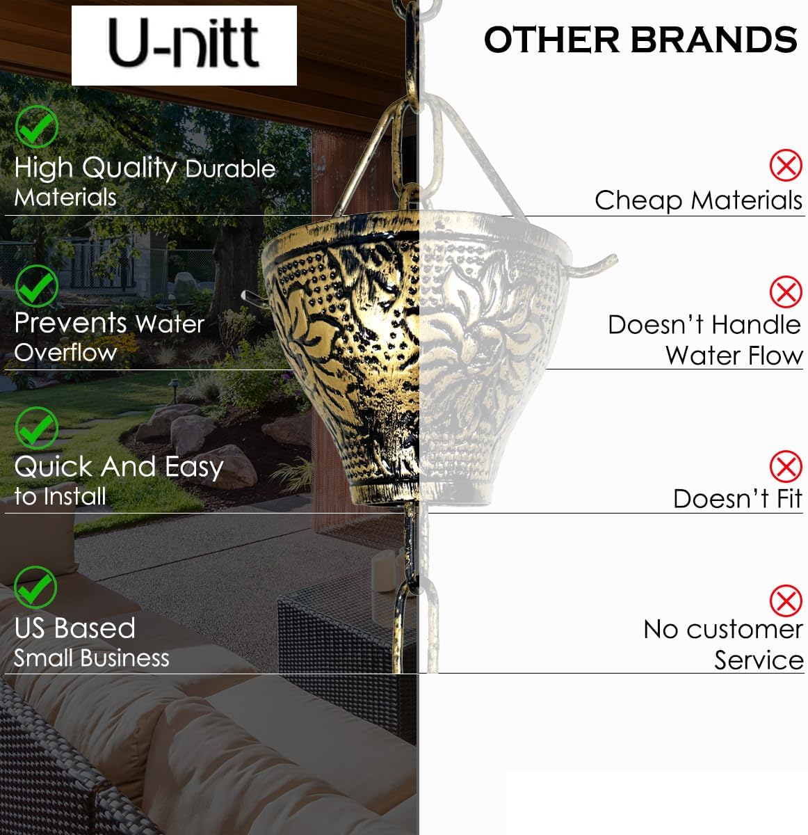 • SUPERIOR CRAFTSMANSHIP - is evident in every detail of this expertly designed U-nitt rain chain. Meticulously crafted from premium, heavy-duty materials, it offers both durability and elegance. Each link or cup is precision-shaped to ensure smooth water flow, effectively guiding rainwater from your gutter in a graceful cascade. Rust-resistant and built to last, this rain chain blends functionality with artistry, adding a refined touch to your home’s exterior while enhancing rainwater management.