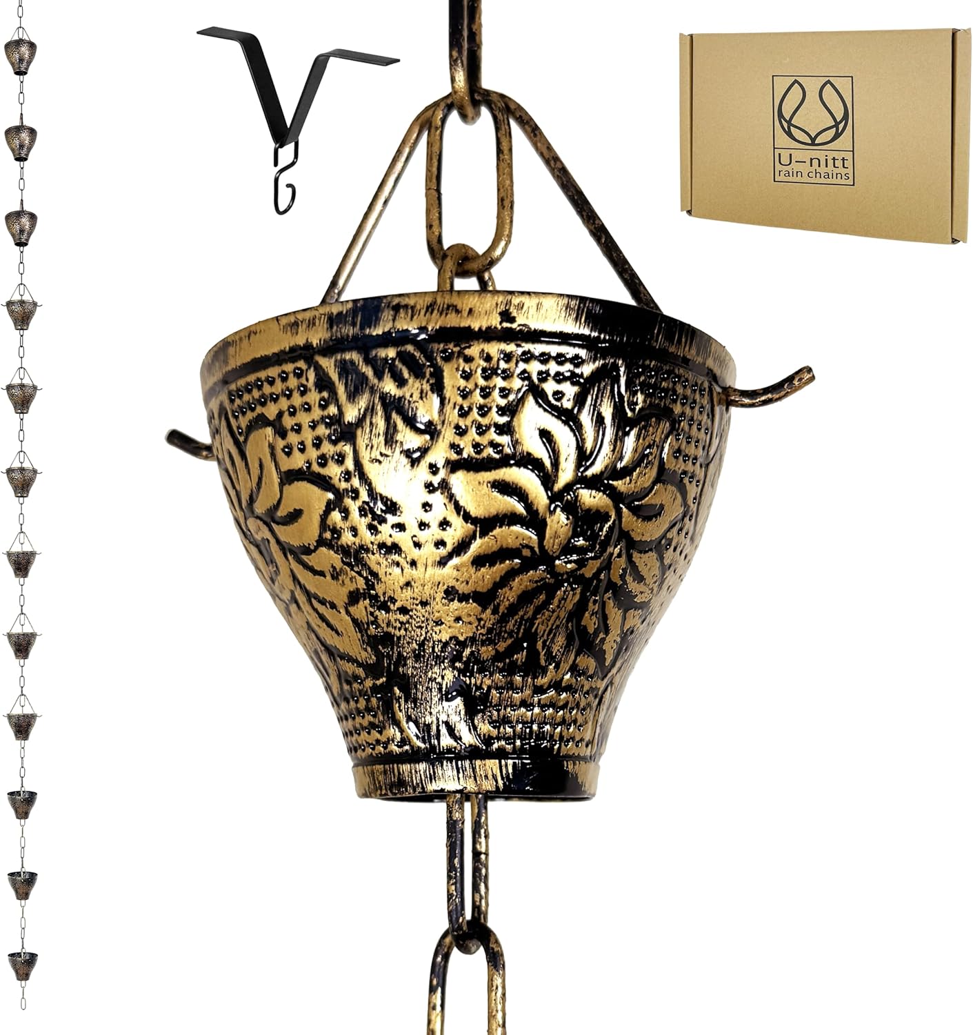 U-nitt Rain Chain Water Collection for Gutters, Rainwater Catcher & Diverter, 8.5 FT Chains for Outside Garden, Sunflower Cups, Roof Downspout, Works with Heavy Rain, w/Gutter Clip for Rainchains