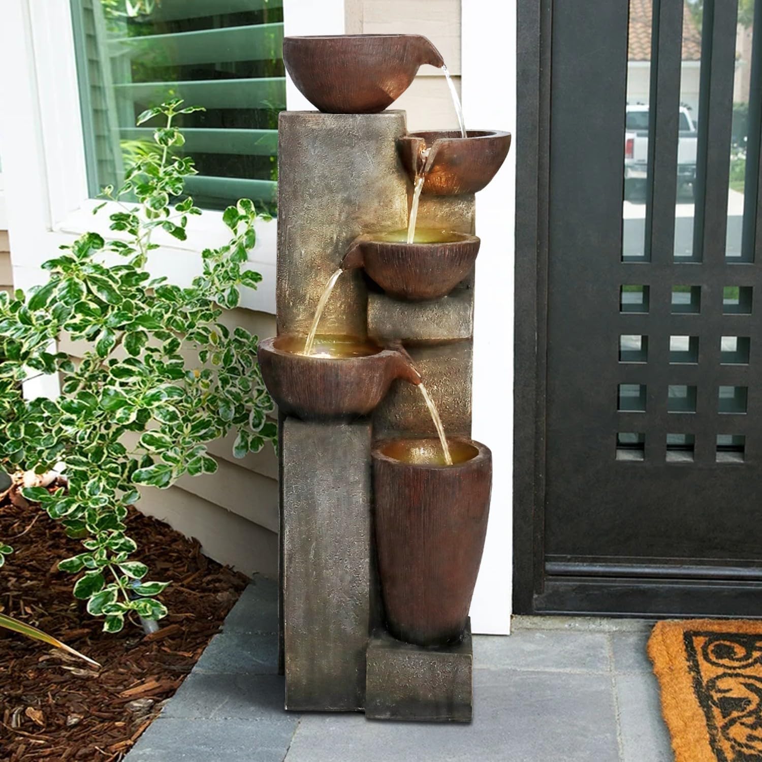 - Durable Design: garden water fountain Constructed from durable resin with a natural stone look, our patio fountains are weatherproof, rust-resistant, and resilient, ensuring your outdoor water features remain rich in artistic touch. Suitable for both outdoor and indoor use.