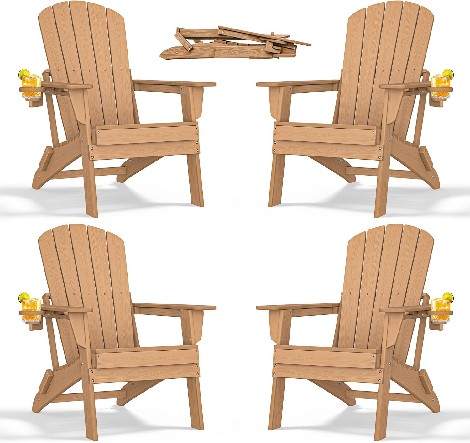 Folding Adirondack Chair - Extended Ergonomic Backrest, Cup Holder - Easy Assembly - Durable HDPE Plastic, Weather Resistant & Maintenance-Free - Lawn, Patio, Deck Supports 380lbs Teak