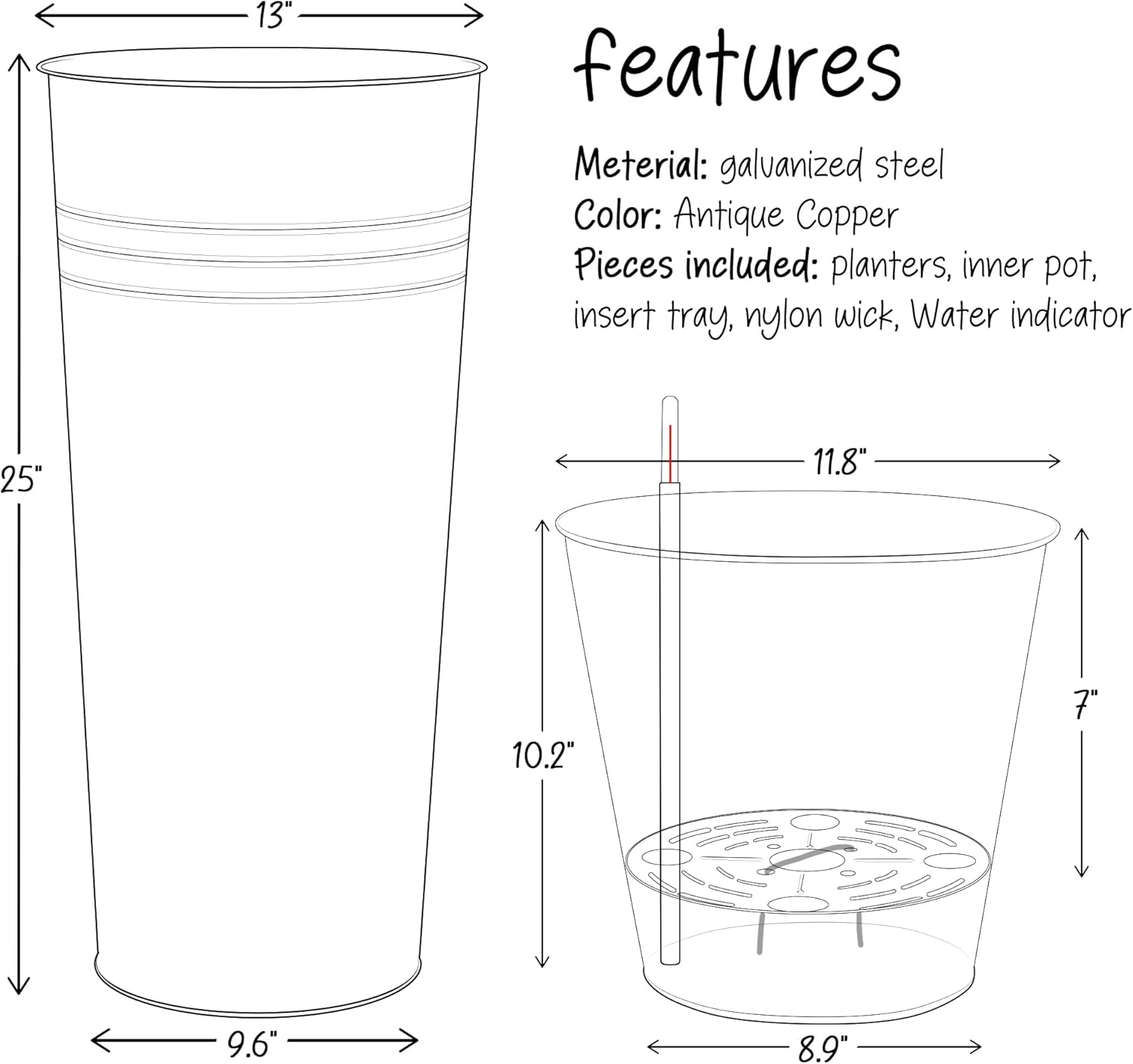 KOL 25'' Tall Galvanized Steel Planter Pot with Water Level Indicator - 2-Pack Self Watering Planters Flower Pot for Plants - Round Powder Metal Planter Box - Indoor Outdoor Grande Plant - Bronze
