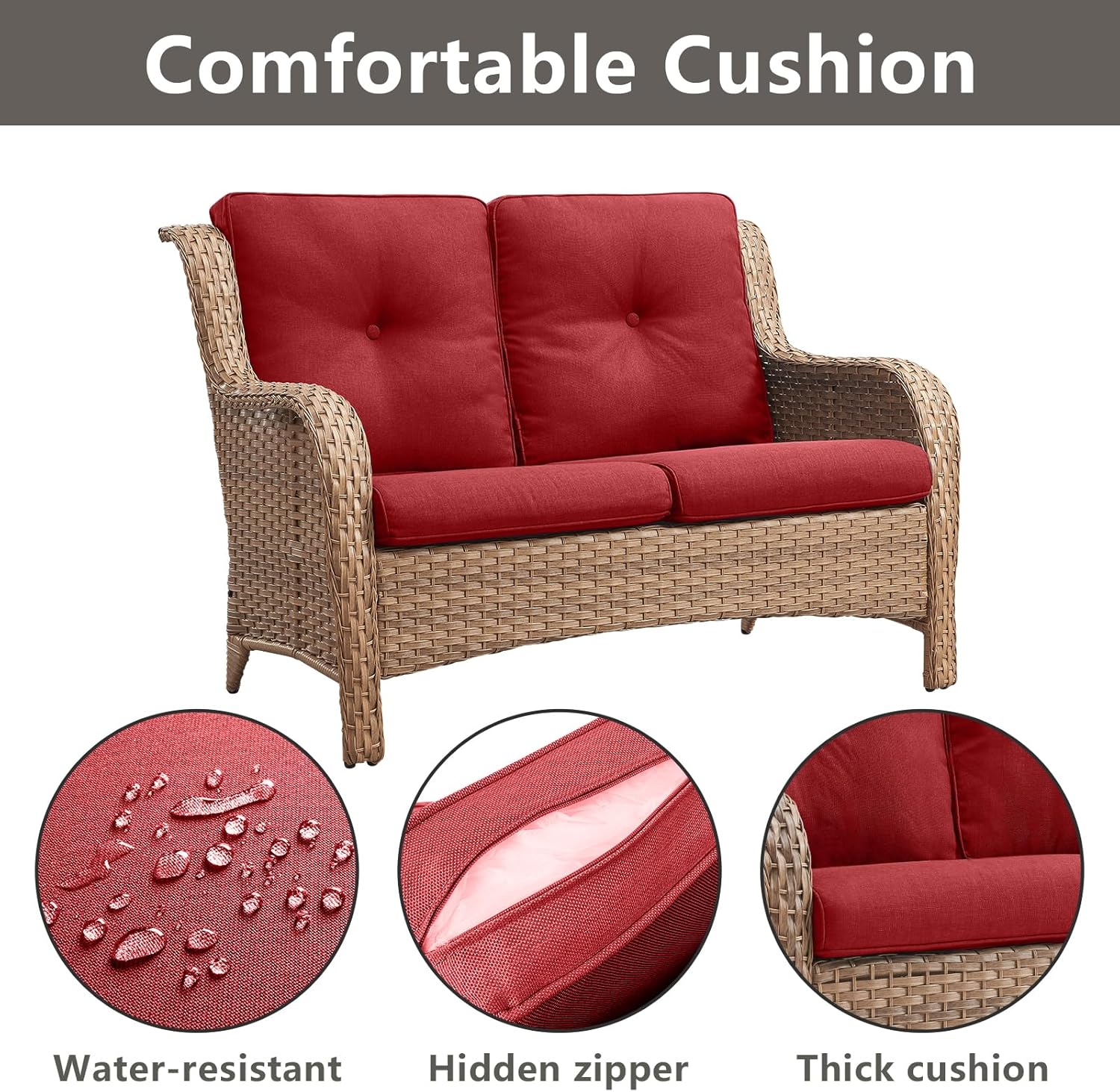 - 【Comfort Cushions & Deep Seating】This patio wicker swivel chairs and loveseat feature deep and wide seats,with 4-inch thick sponge-padded seat cushions,5-inch back cushion create the ultimate patio seating experience.