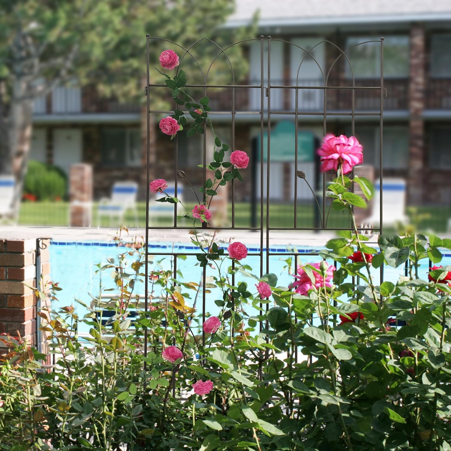 - Plants Supporting Trellis: This brown metal garden trellis is perfect for supporting all kinds of flowering trellis plants, wall-climbing vines. It allows them to grow naturally up towards the top.
