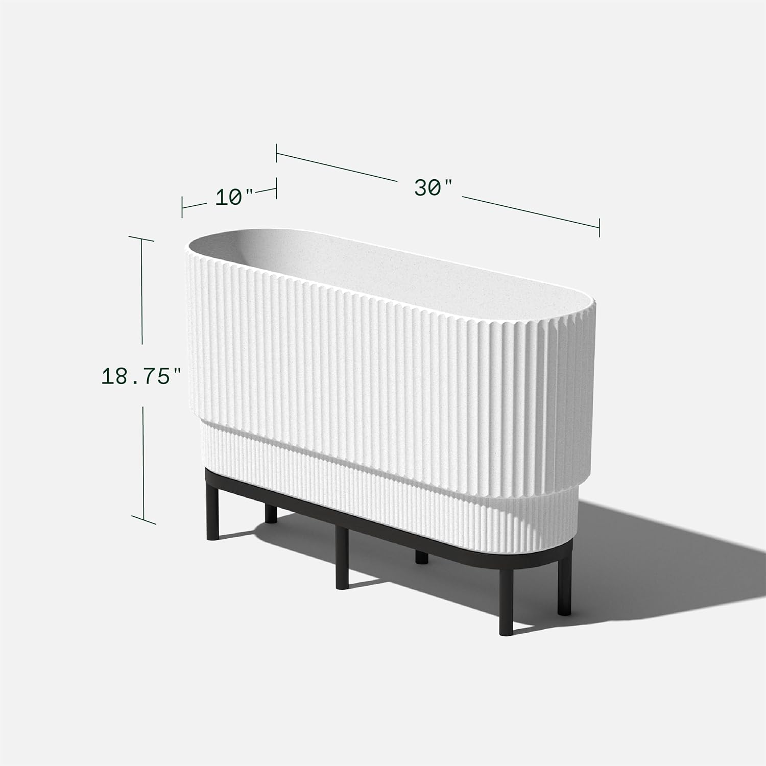 • DIMENSIONS & DETAILS: The Raised Demi Long planter measures 30 Inches in length, 10 inches in width and 14.25 Inches in height. On the stand, the planter measures 19 Inches in height