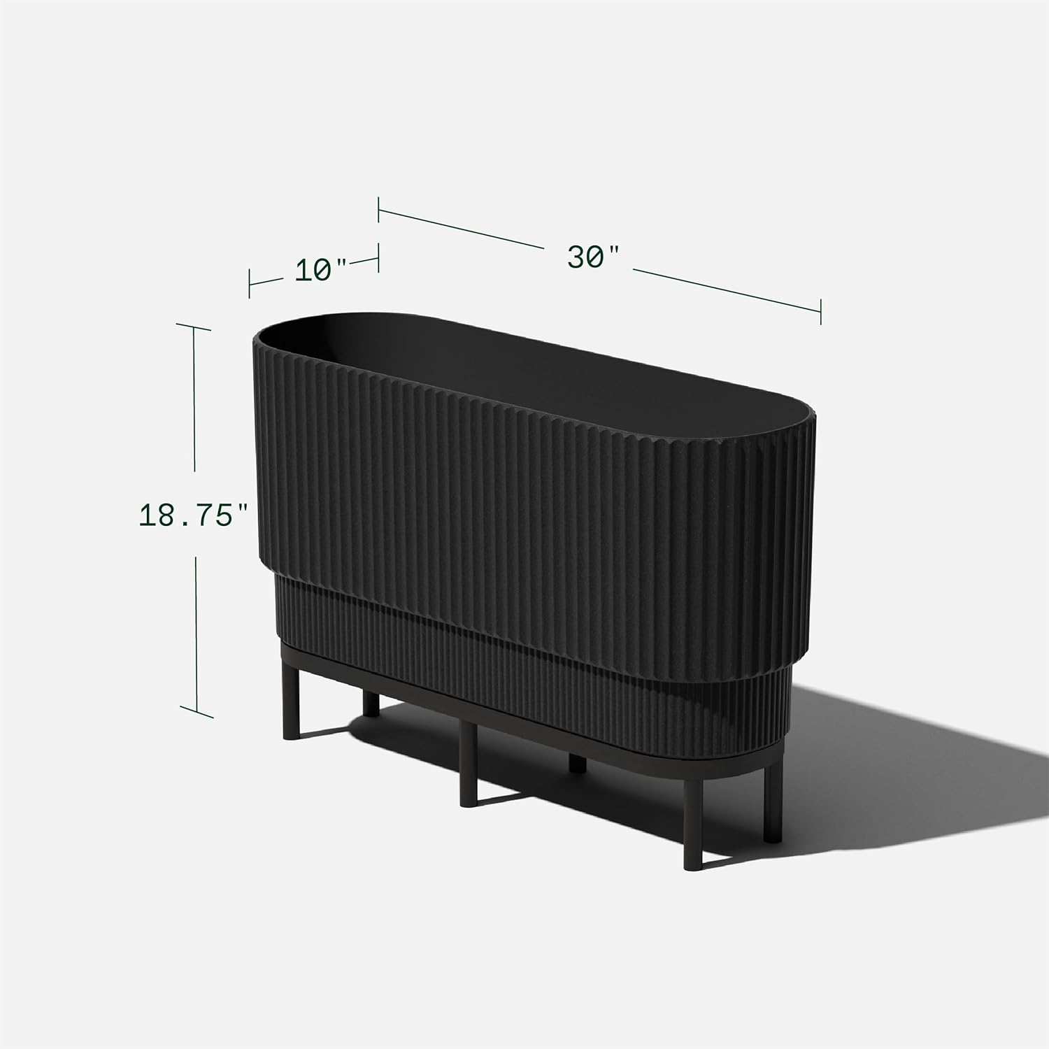 • DIMENSIONS & DETAILS: The Raised Demi Long planter measures 30 Inches in length, 10 inches in width and 14.25 Inches in height. On the stand, the planter measures 19 Inches in height