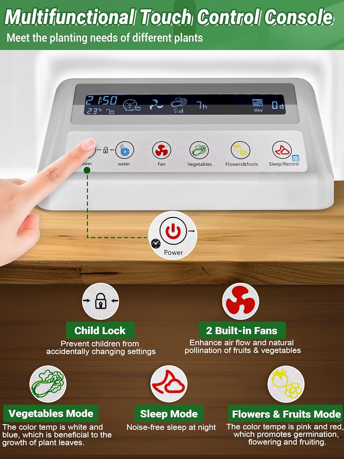 - Special Feature : ①102 28W LED Grow Lights ②10L Large Water Tank ③Two-fan Ventilation System ④Intelligent Water Pump ⑤2 Grow Light Modes ⑥Child Lock Function ⑦7.6-23.8-inch Height Adjustable ⑧Leak-Proof ⑨Easy to Clean ⑩Growing 17 Plants at Once ①102 28W LED Grow Lights ②10L Large Water Tank ③Two-fan Ventilation System ④Intelligent Water Pump ⑤2 Grow Light Modes ⑥Child Lock Function ⑦7.6-23.8-… See more