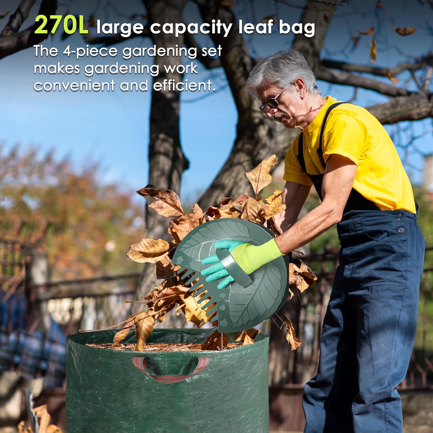 - Storage Bin: 272L large lawn bag can hold a lot of leaves at one time, allowing you to save time during trips back and forth to dump the leaves. And there are added handles on the side and bottom to make it easier for you to use. The PP material is scratch-proof and waterproof, and can better contain fallen leaves, branches and other yard waste.