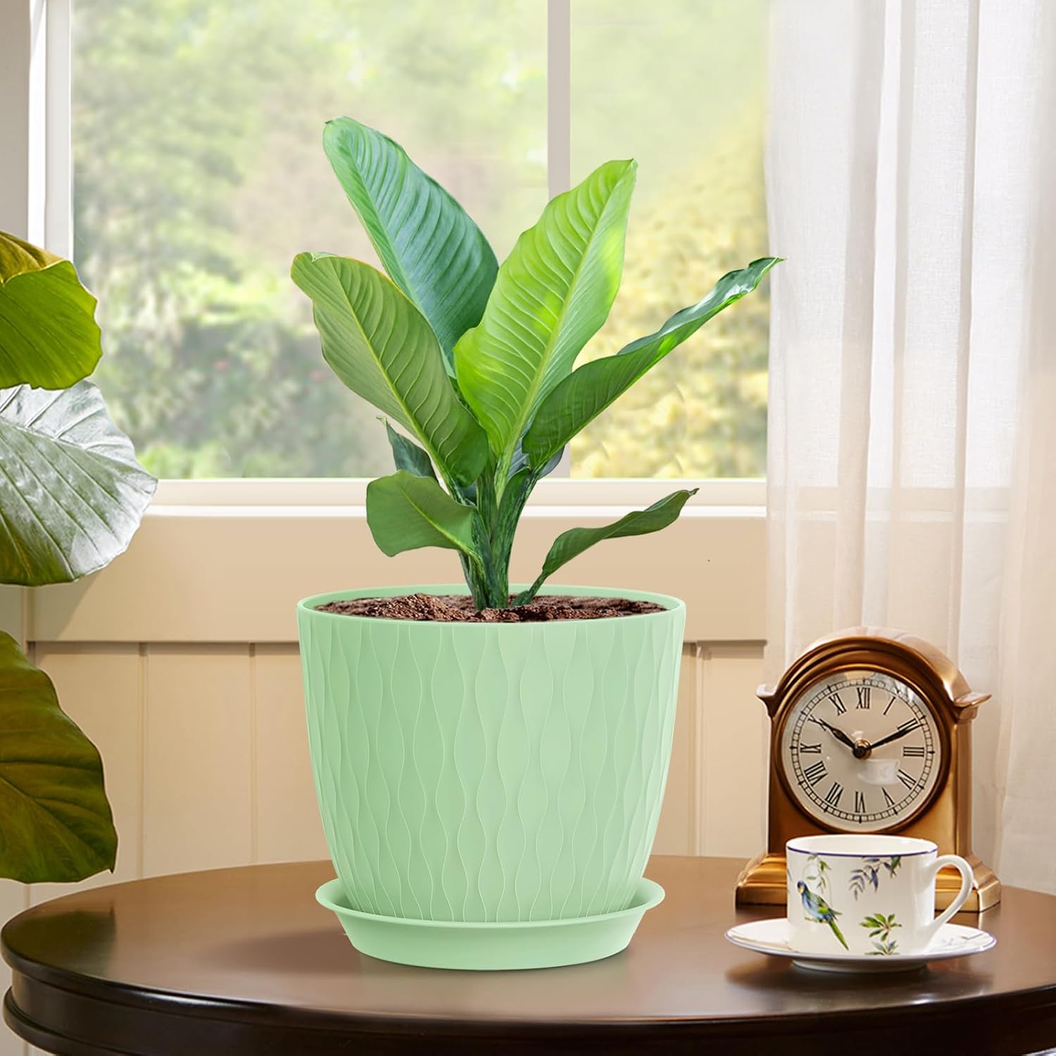 7 inch Flower Pots, 5 Pack Plant Pots with Drainage Holes and Saucers for Indoor Plants, Plastic Planters with Water Ripple for Small Garden House Plants, Nursery Pots for Succulent, Green