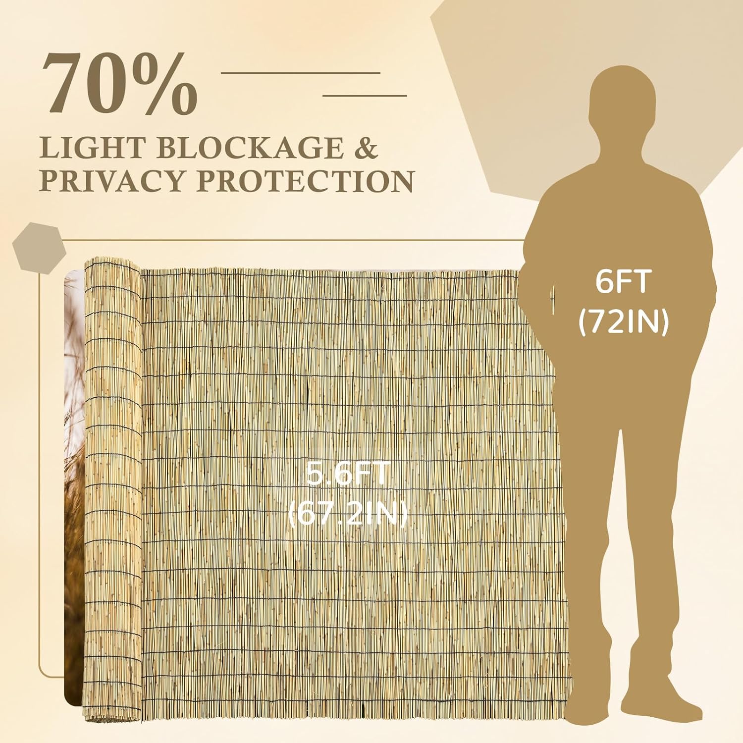 - Material and Craftsmanship: Each reed screen is meticulously hand-selected, and the garden reed fencing is woven together with cotton strings. The bamboo reed fencing can block 70% of the sun's heat, providing more shade and keeping the area cool throughout the summer