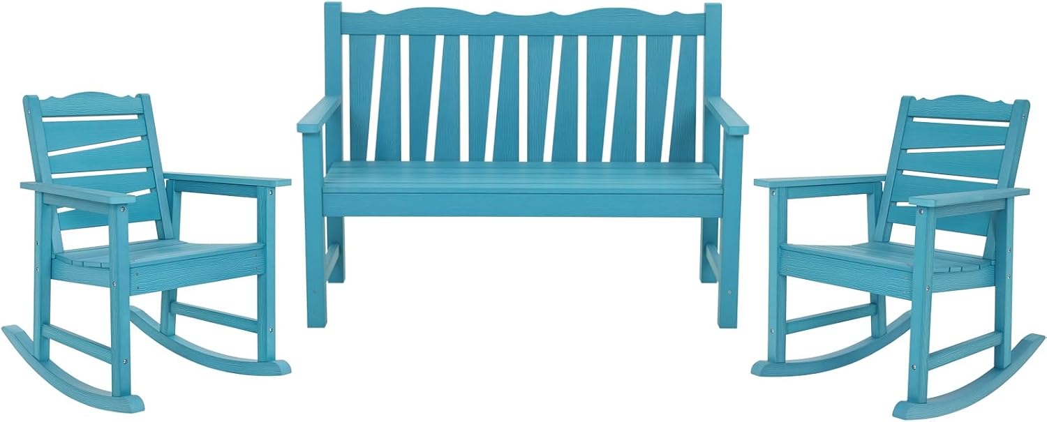 Outdoor Rocking Chairs Set, Weatherproof HIPS Outdoor Furniture, Include 2 Patio Rocking Chairs + Outdoor Bench, Suit for Garden, Porch, Lawn & Backyard(Lake Blue)