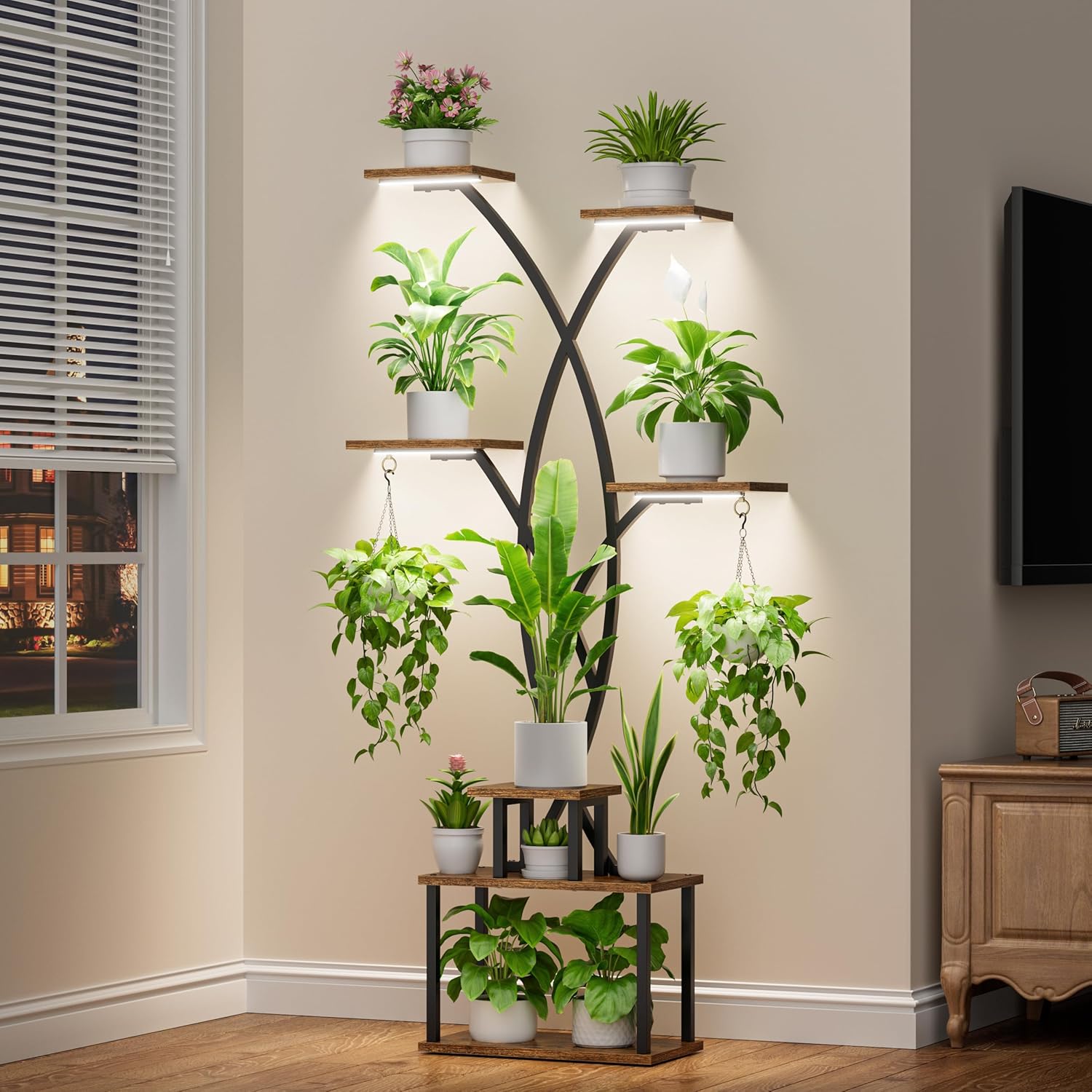 - [Ideal for Expressing Love]: With its unique tree design and contemporary grow lights, this indoor plant shelf not only elevates your home decor but also serves as an ideal present to express your love and zest for life. Versatile in design, it's a perfect fit for various home settings, be it the living room, balcony, or office.