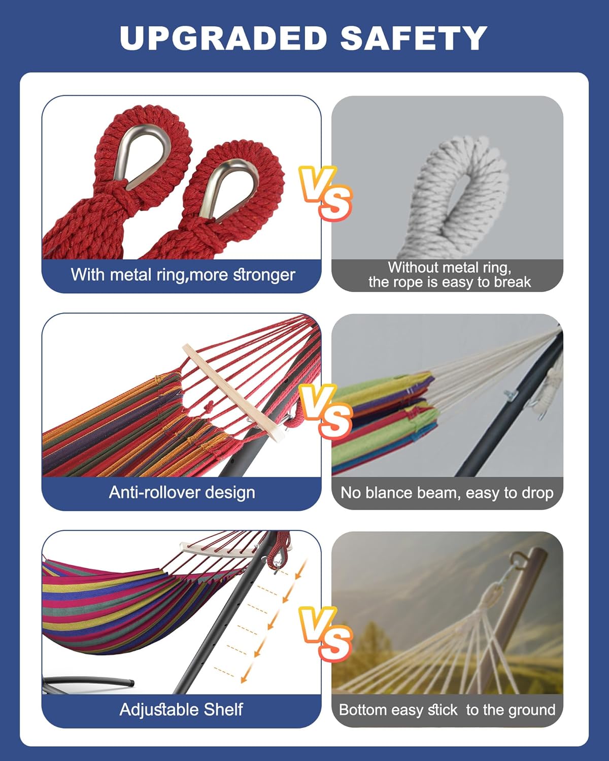 - Anti-Rollover Design: Our double Hammocks feature Balance spreader bars for an anti-rollover design, ensuring even hole spacing and a tight hammock for optimum balance. Enjoy a secure and stable relaxation experience