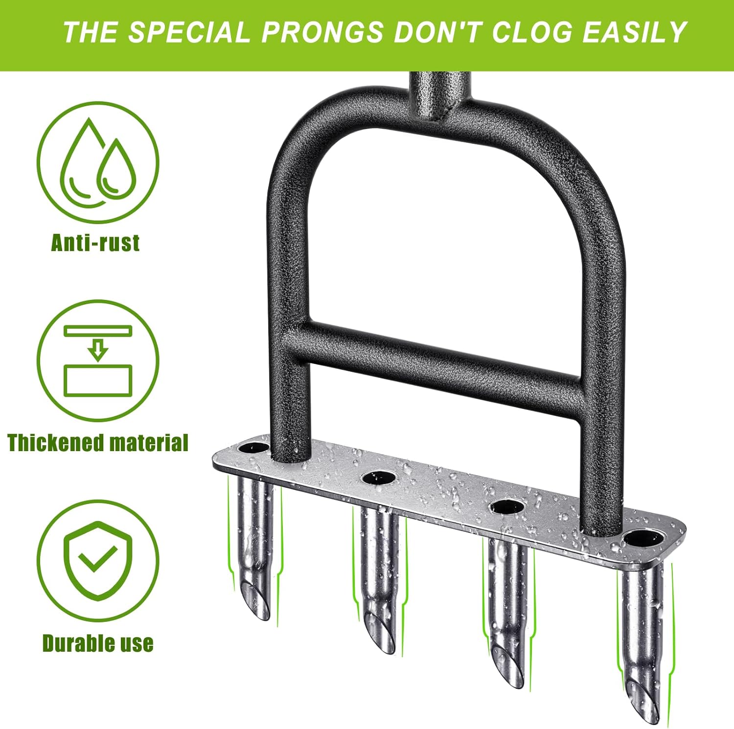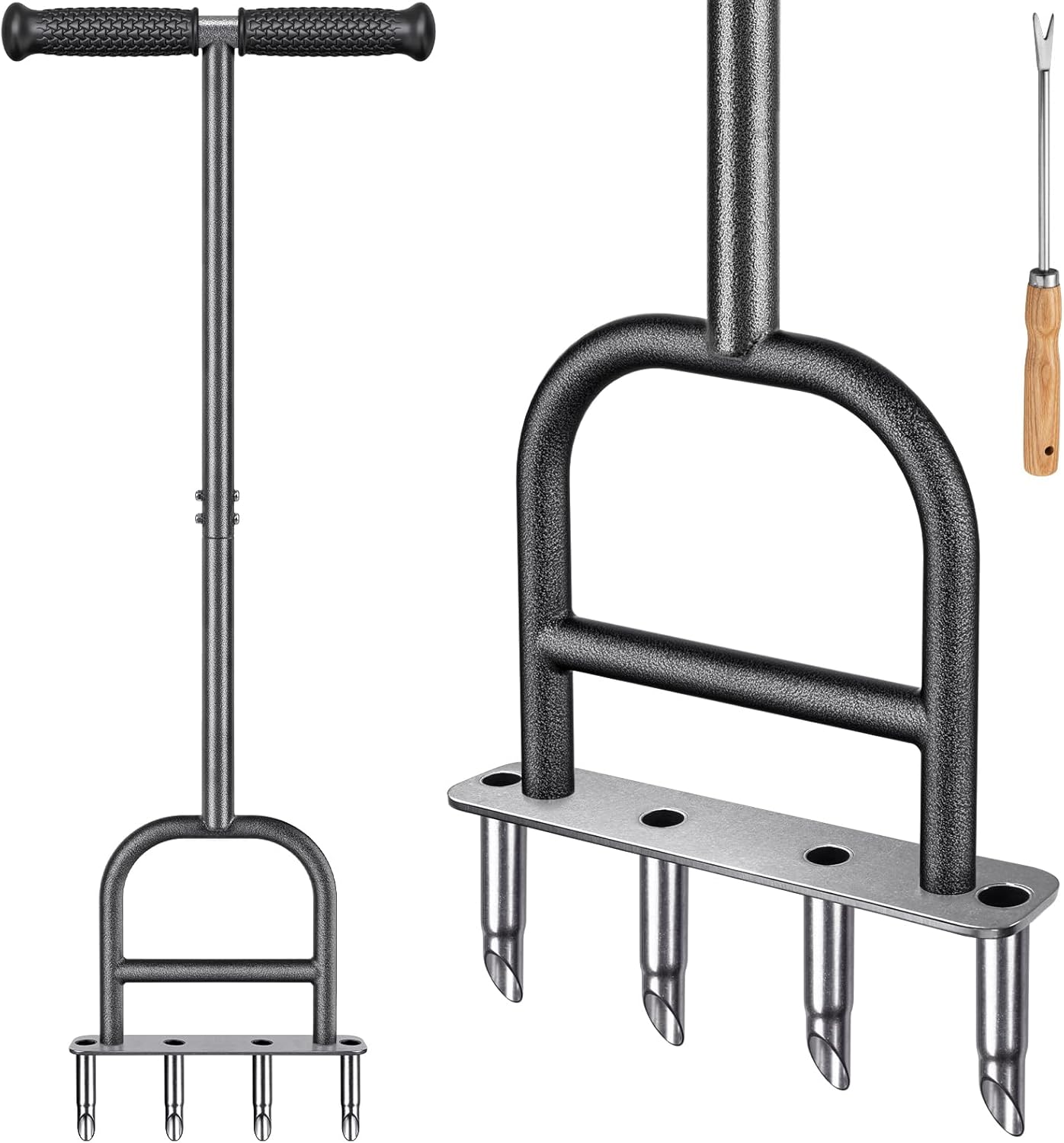 - 4 Stainless Steel Coring Plugs: Our 4 core aerator plugs uses stainless steel material that will not rust or bend out of shape. Additionally, our rod is made from high-quality solid steel with a black powder coating on the surface to ensure long-term use of the tool.