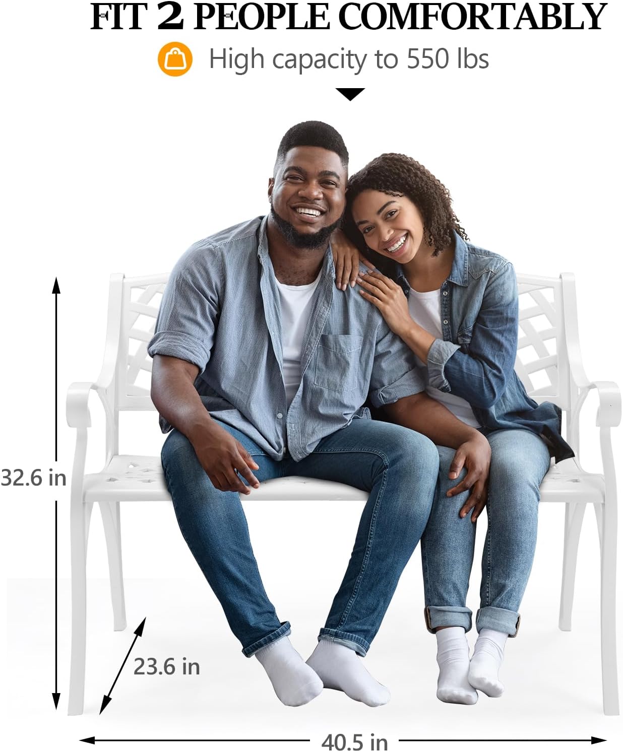 VINGLI 40.5" Patio Garden Bench,Anti- Rust Cast Iron Cast Aluminum Frame for Outdoor Path Yard Lawn Work Entryway Decor Deck (White)