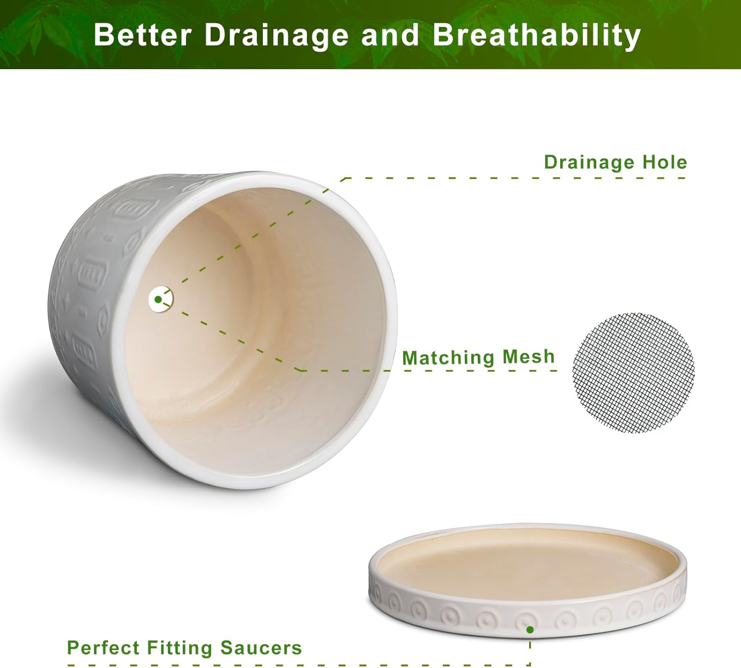 - Optimal Drainage: The plant pots with drainage holes and saucers ensures high and well water flow and air circulation, keeping your plants growth while avoiding excess water from spilling and staining your surfaces