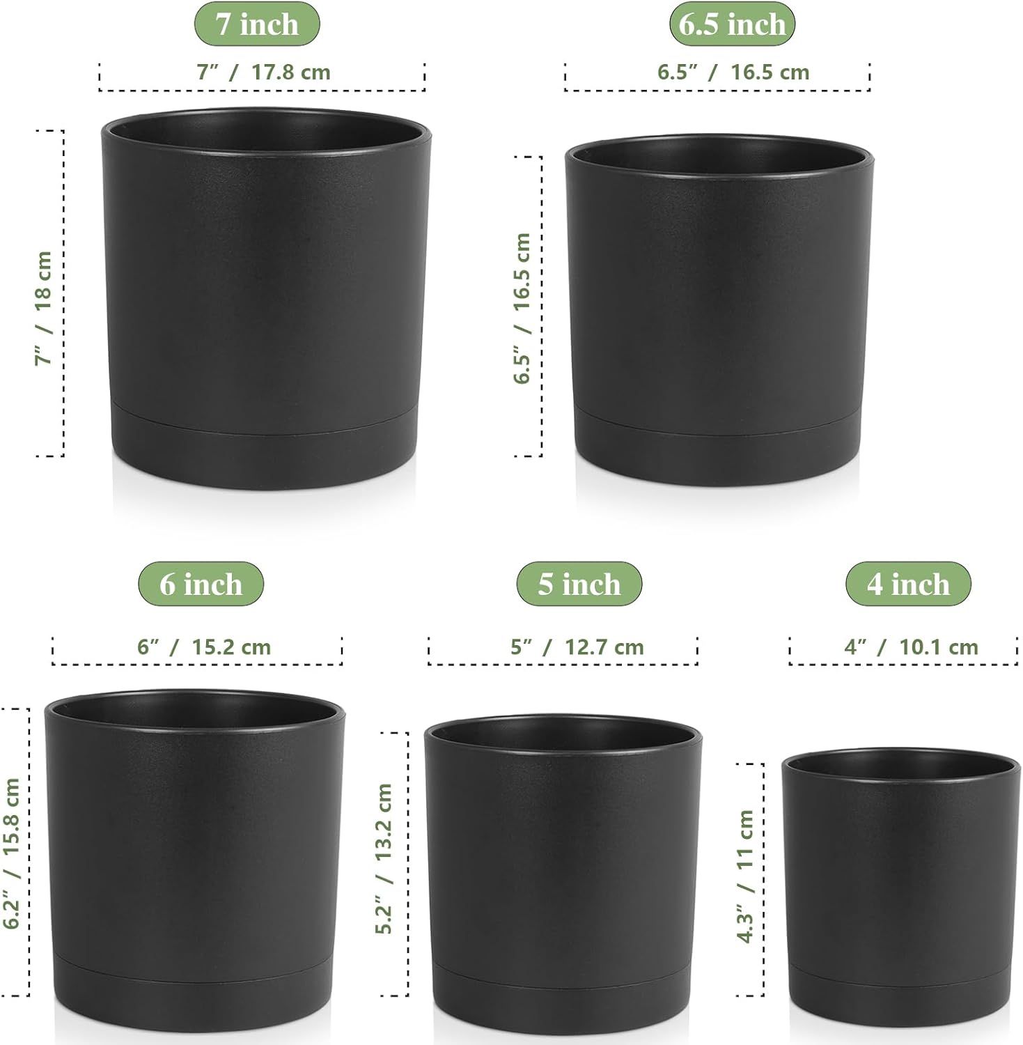 7/6.5/6/5/4 inch Plant Pots for Small Indoor Outdoor Plants, 5 Pack Cylinder Flower Pots with Drainage Holes and Saucers, Plastic Planters for Garden Succulent House Plants, Black