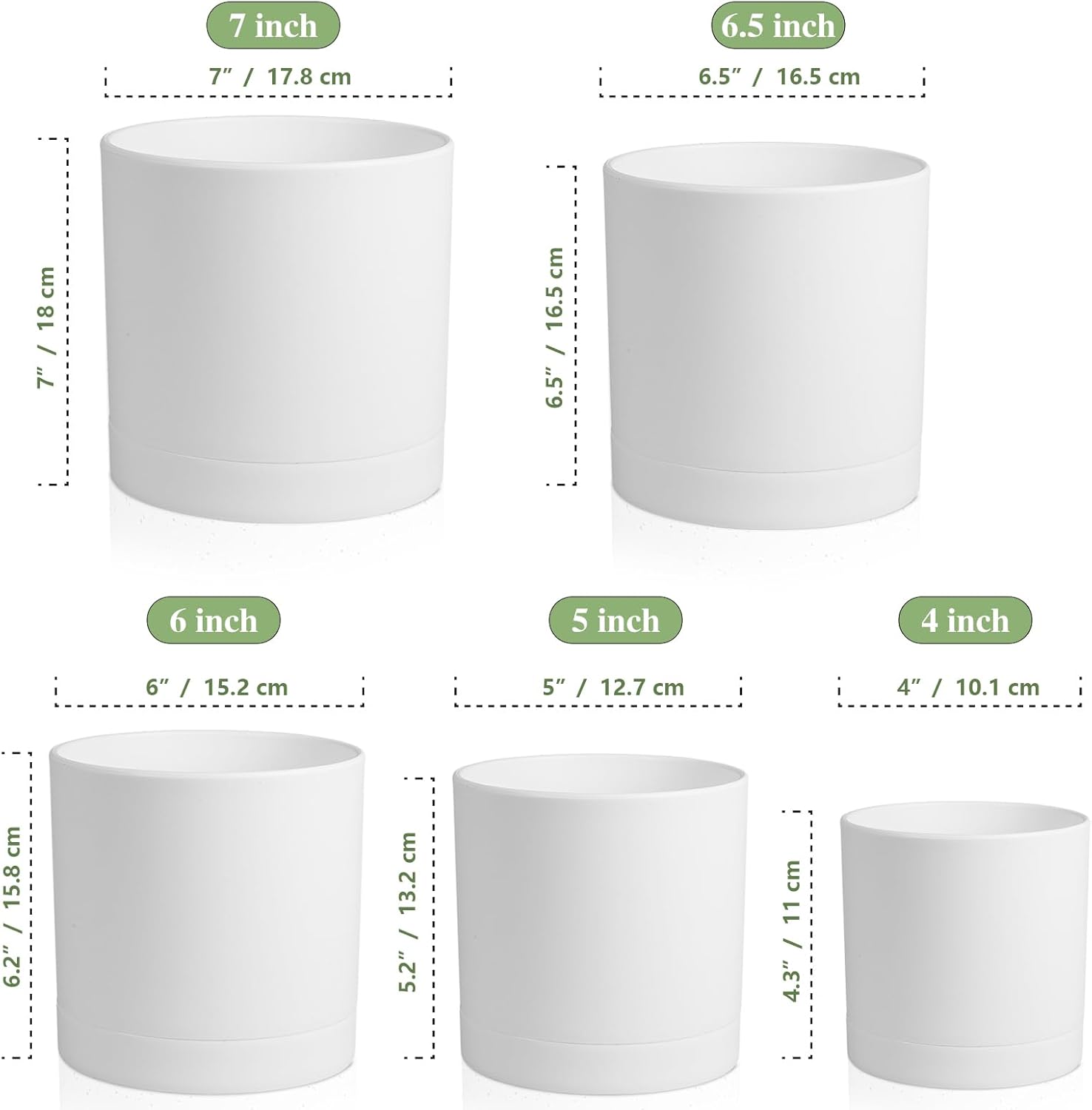 7/6.5/6/5/4 inch Flower Pots, 5 Pack Cylinder Plant Pots for Small Indoor Outdoor Plants, Plastic Planters with Drainage Holes and Saucers for Garden Succulent Nursery House Plants, White