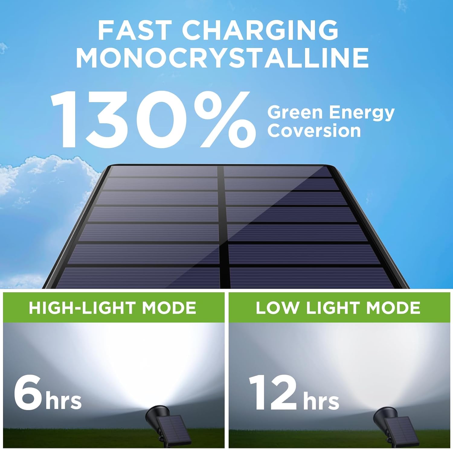 - Improved Brightness & 2 Working Modes: With super brightness, this solar spotlight can cast a focused ray to highlight your flagpole or beautiful sculpture, even on the darkest of nights. You have the option to set from High Mode (MAX 6Hrs) to Low Mode (MAX 12Hrs) to extend working time.