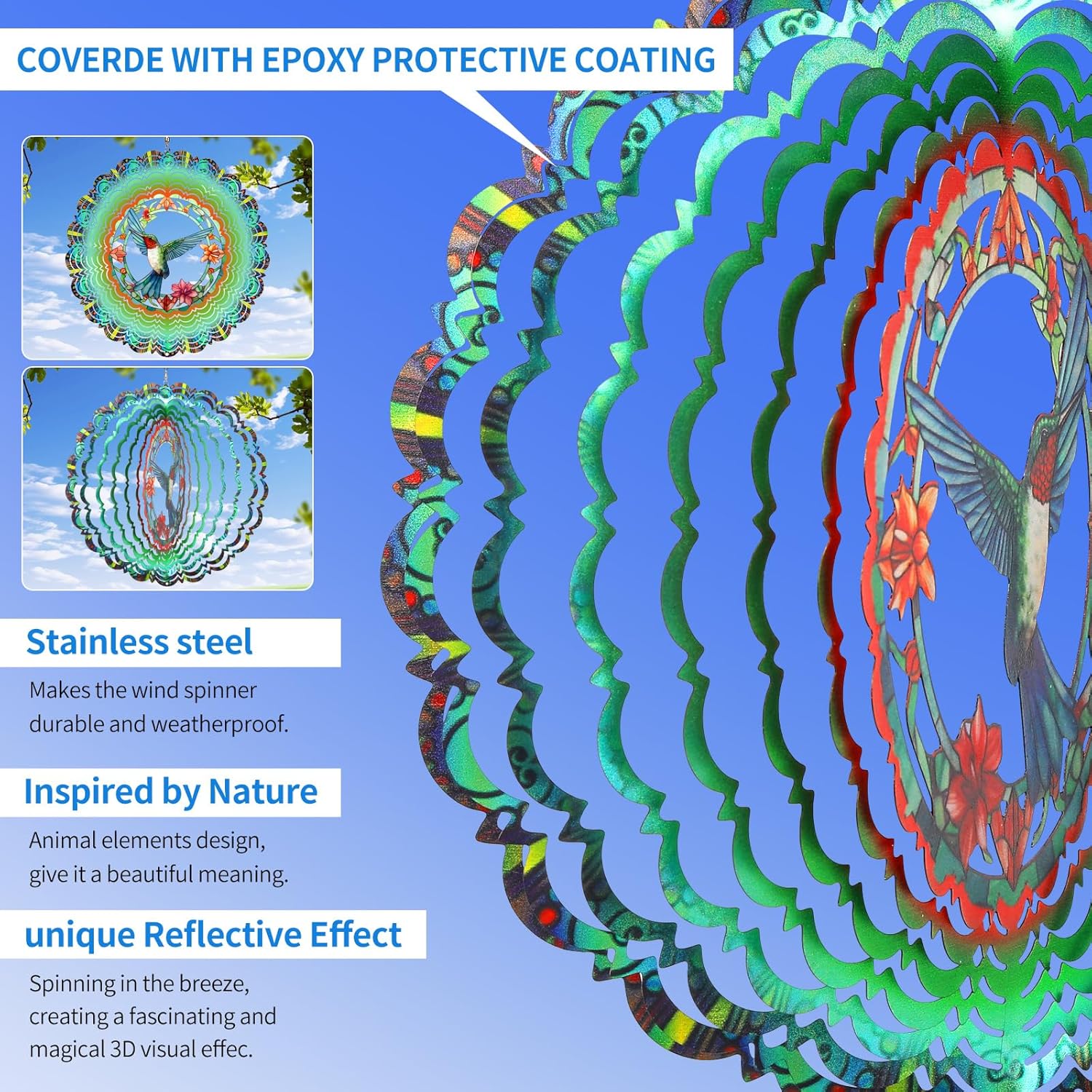 - 12inch 3D Hummingbird Wind Spinner Outdoor Decor - Cawalap Hummingbird Metal Wind Spinner is made from Sturdy stainless steel material by laser-cutting technology to form vivid shape, makes it flexible and strong, is individually hand painted by epoxy protective coating with colorful sparkle powder inside to highly resist weather and rust. a frosted paint finish, giving off a sparkling when it spin. The unique design combined meaningful animal pattern and a 3D streamer effect.