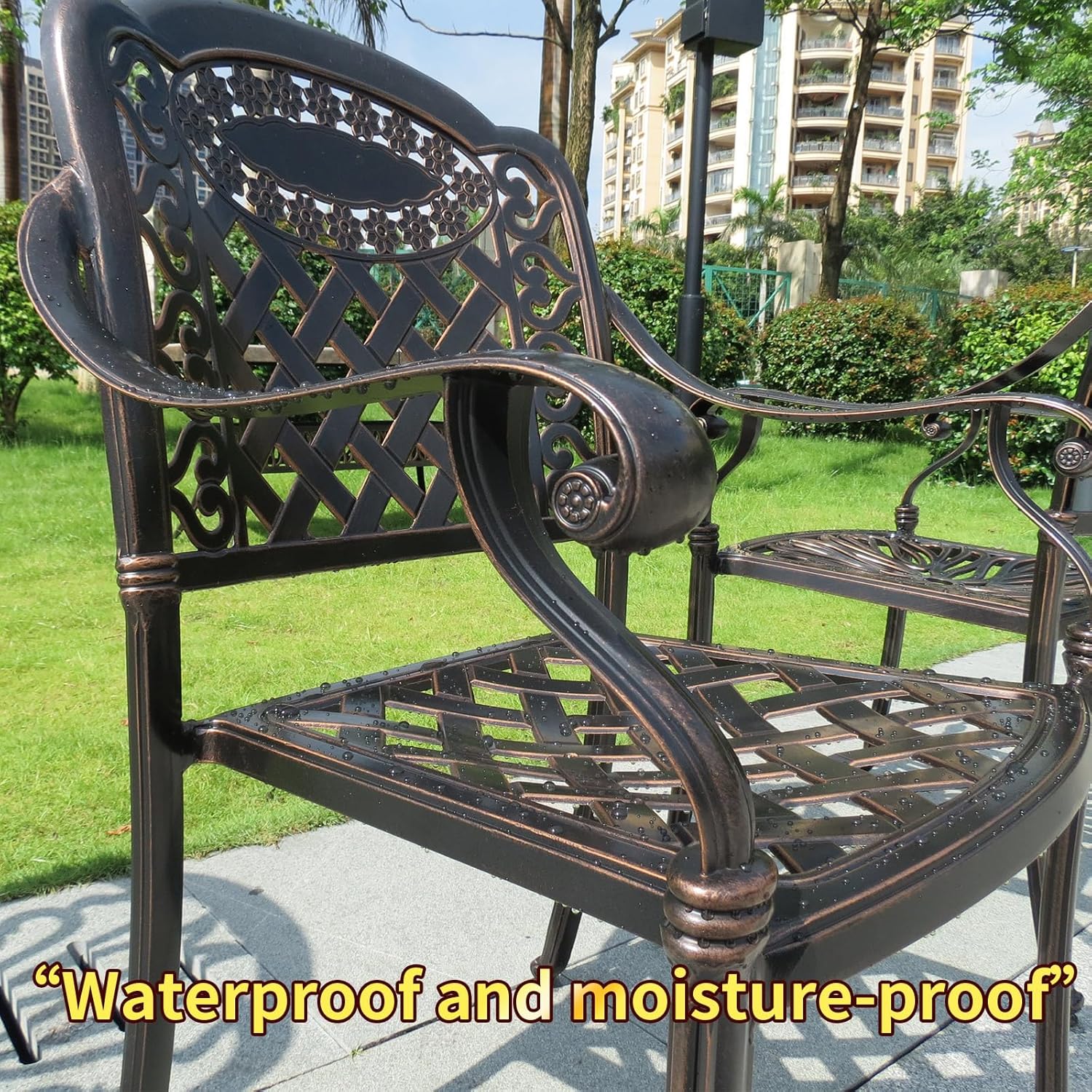 - All weather materials: Made of sturdy cast aluminum with a water-resistant and fade-proof finish. Our patio benches bistro chairs is durability and sunproof, these all-weather features will allow you to use the chairs for a long time